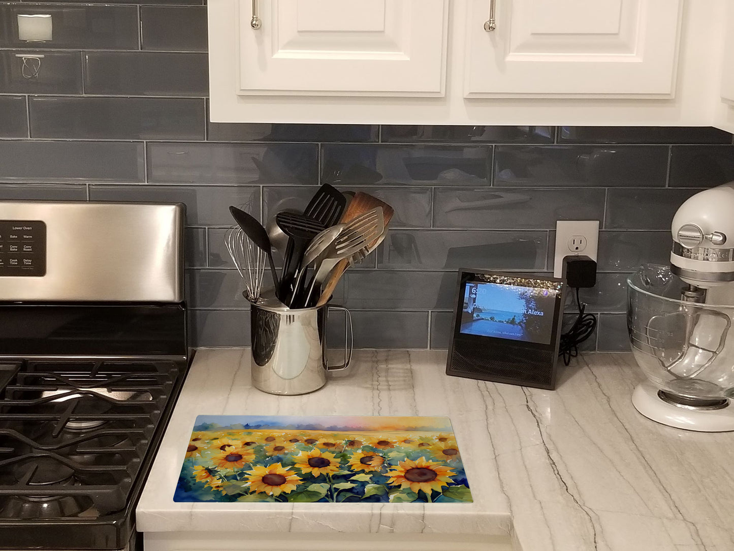 Glass Cutting Board featuring breed specific Sunflowers artwork. Introduce your kitchen to the vibrant, large Decorative Glass Cutting Board from Caroline's Treasures. Crafted from resilient tempered glass, this board is not only a utilitarian necessity but also a colorful art piece. With its generous dimensions of 15 inches in height and 12 inches in length, it offers ample space for all your cutting needs. Every piece showcases captivating artwork from distinguished artists, bringing an aesthetic edge to your kitchen. Beyond its attractive design, this cutting board ensures your countertop stays pristine and unscathed, owing to its heat-resistant properties. Engineered with user convenience in mind, it features non-skid feet for stability, and rounded corners for additional safety. Its robust construction renders it virtually unbreakable, guaranteeing longevity. The board comes with protective feet bumpers, maintaining its position during use. This product is recommended to be hand washed only. Proudly printed and assembled in the United States, this cutting board exemplifies superior craftsmanship. With Caroline's Treasures' Decorative Glass Cutting Board, you're investing in a blend of functionality and artistic flair.