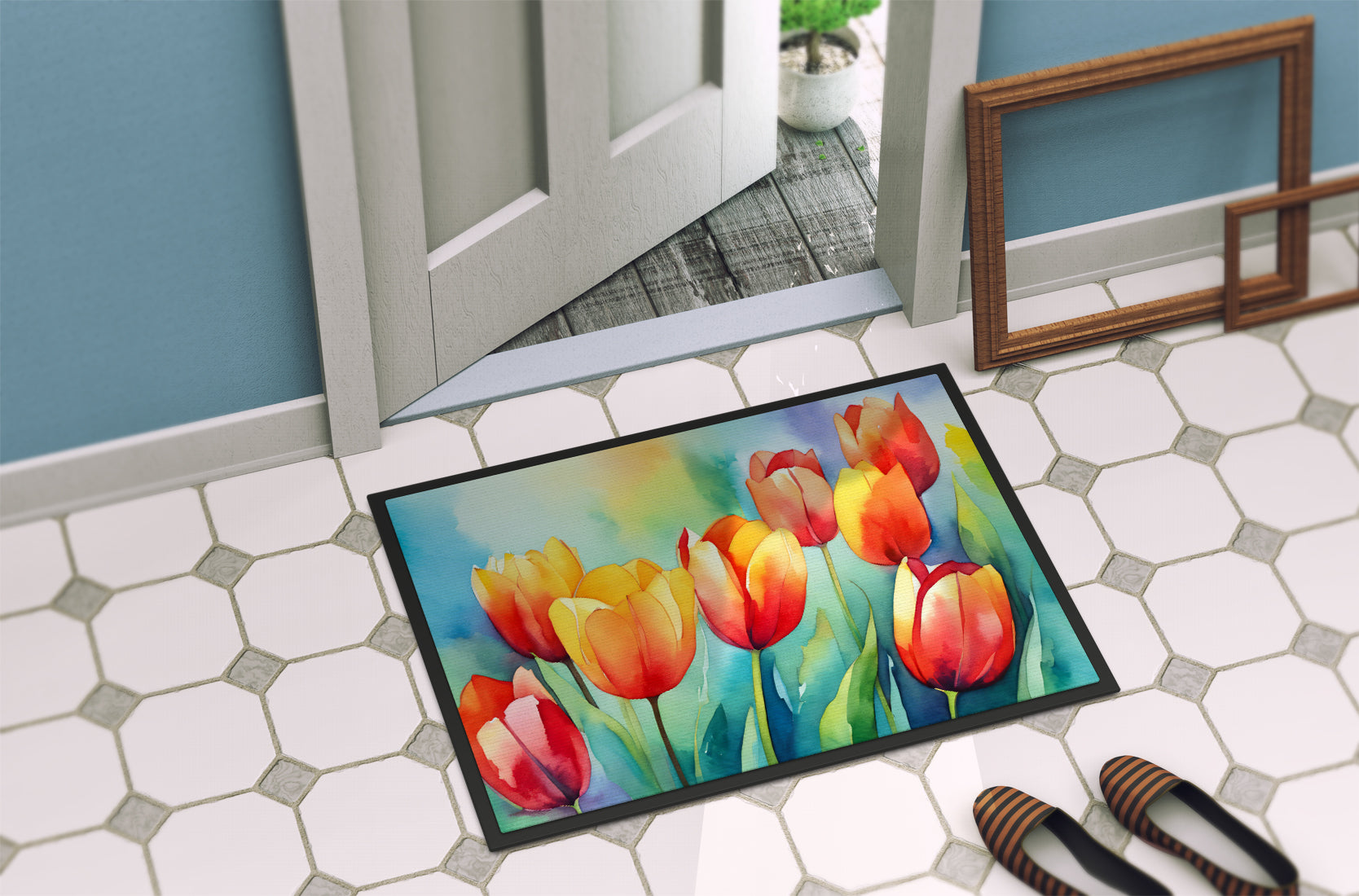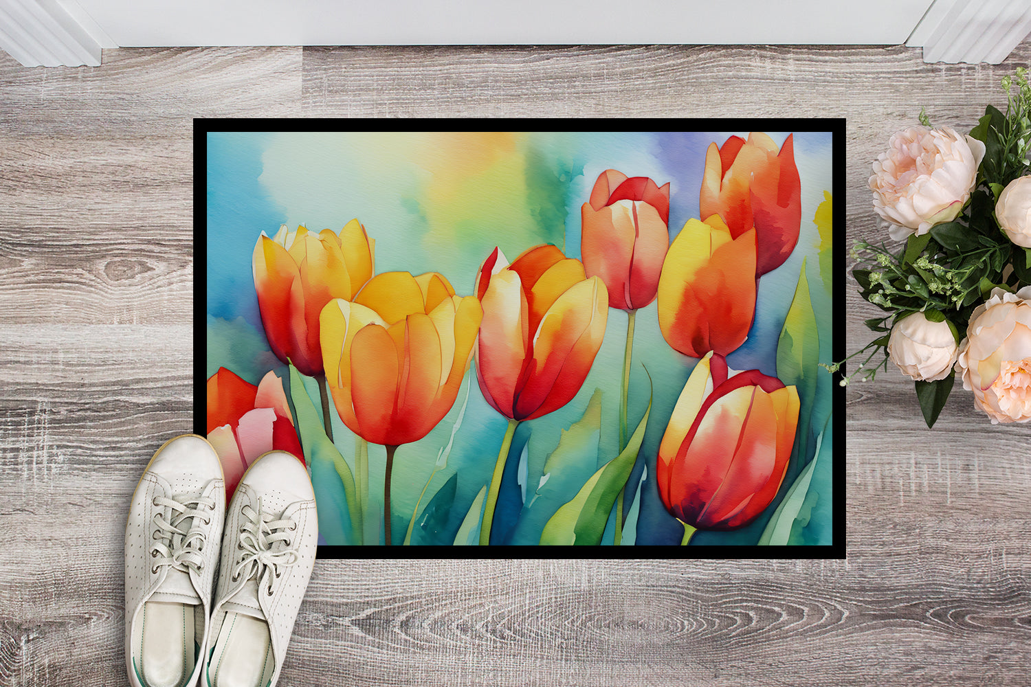 Doormat featuring breed specific Tulips artwork. Welcome your guests in style with our Artwork Door Mat, designed to withstand almost any weather condition. This mat, measuring approximately 18 by 27 inches, is held together by durable black binding tape. Its top layer, composed of polyester felt, is dyed with the eye-catching image you see on the mat. A few layers below provide the mat with stability, while its rubber bottom is stamped to help prevent slipping and ensures safety. Our mat works wonderfully as both an indoor or outdoor door mat. For cleaning, simply hose it off with water or use a power washer - no need for any cleaner that produces suds. Avoid scrubbing with a brush, instead, opt for the vacuum on floor setting. Designed manufactured and printed in the USA, this mat is a perfect addition to your porch, outdoor kitchen, entryway, or any indoor space. Its unique design makes it a charming decorative rug that greets your guests and adds a stylish touch to your home decor.