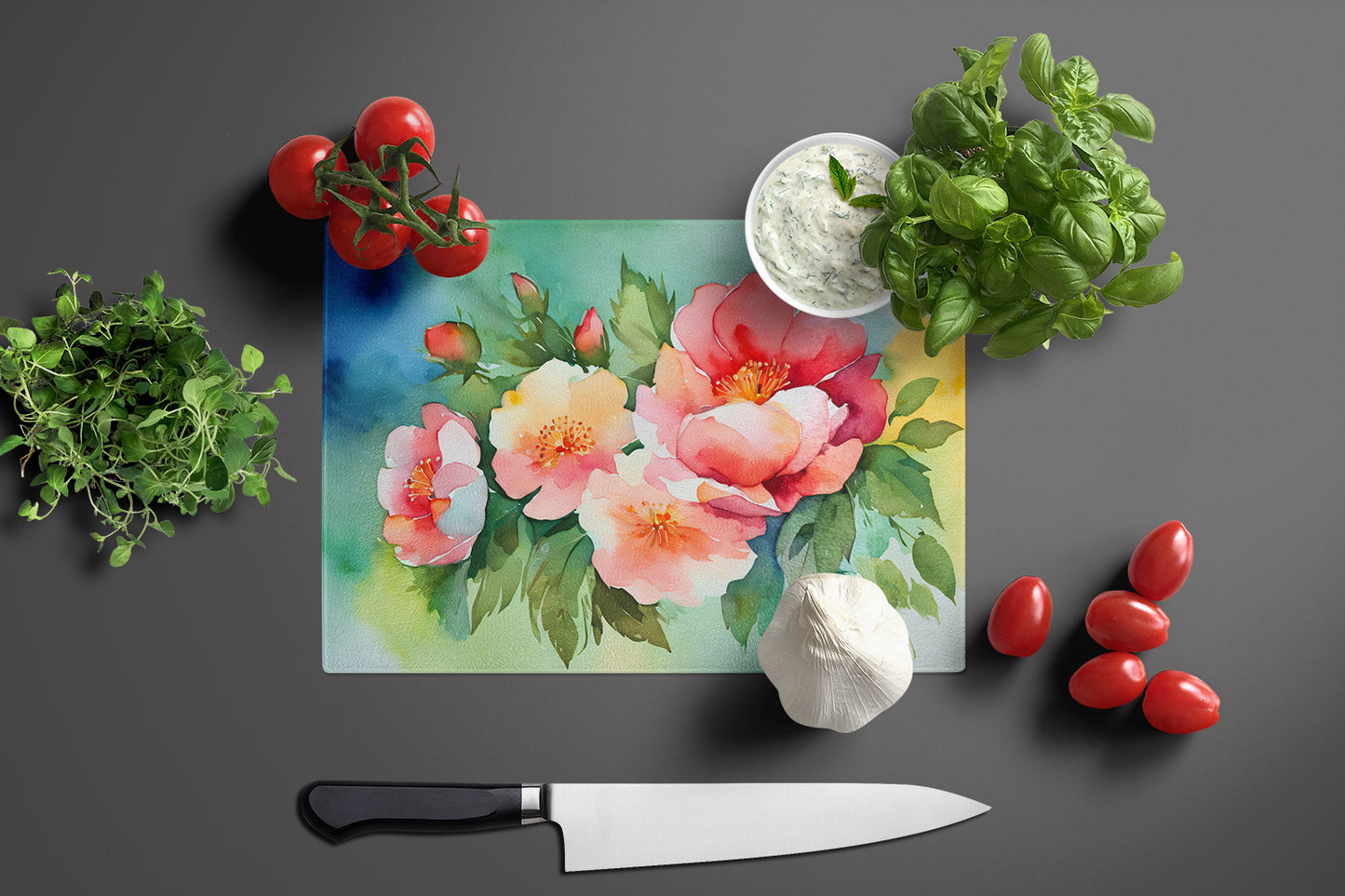Glass Cutting Board featuring breed specific Georgia Cherokee Rose artwork. Introduce your kitchen to the vibrant, large Decorative Glass Cutting Board from Caroline's Treasures. Crafted from resilient tempered glass, this board is not only a utilitarian necessity but also a colorful art piece. With its generous dimensions of 15 inches in height and 12 inches in length, it offers ample space for all your cutting needs. Every piece showcases captivating artwork from distinguished artists, bringing an aesthetic edge to your kitchen. Beyond its attractive design, this cutting board ensures your countertop stays pristine and unscathed, owing to its heat-resistant properties. Engineered with user convenience in mind, it features non-skid feet for stability, and rounded corners for additional safety. Its robust construction renders it virtually unbreakable, guaranteeing longevity. The board comes with protective feet bumpers, maintaining its position during use. This product is recommended to be hand washed only. Proudly printed and assembled in the United States, this cutting board exemplifies superior craftsmanship. With Caroline's Treasures' Decorative Glass Cutting Board, you're investing in a blend of functionality and artistic flair.