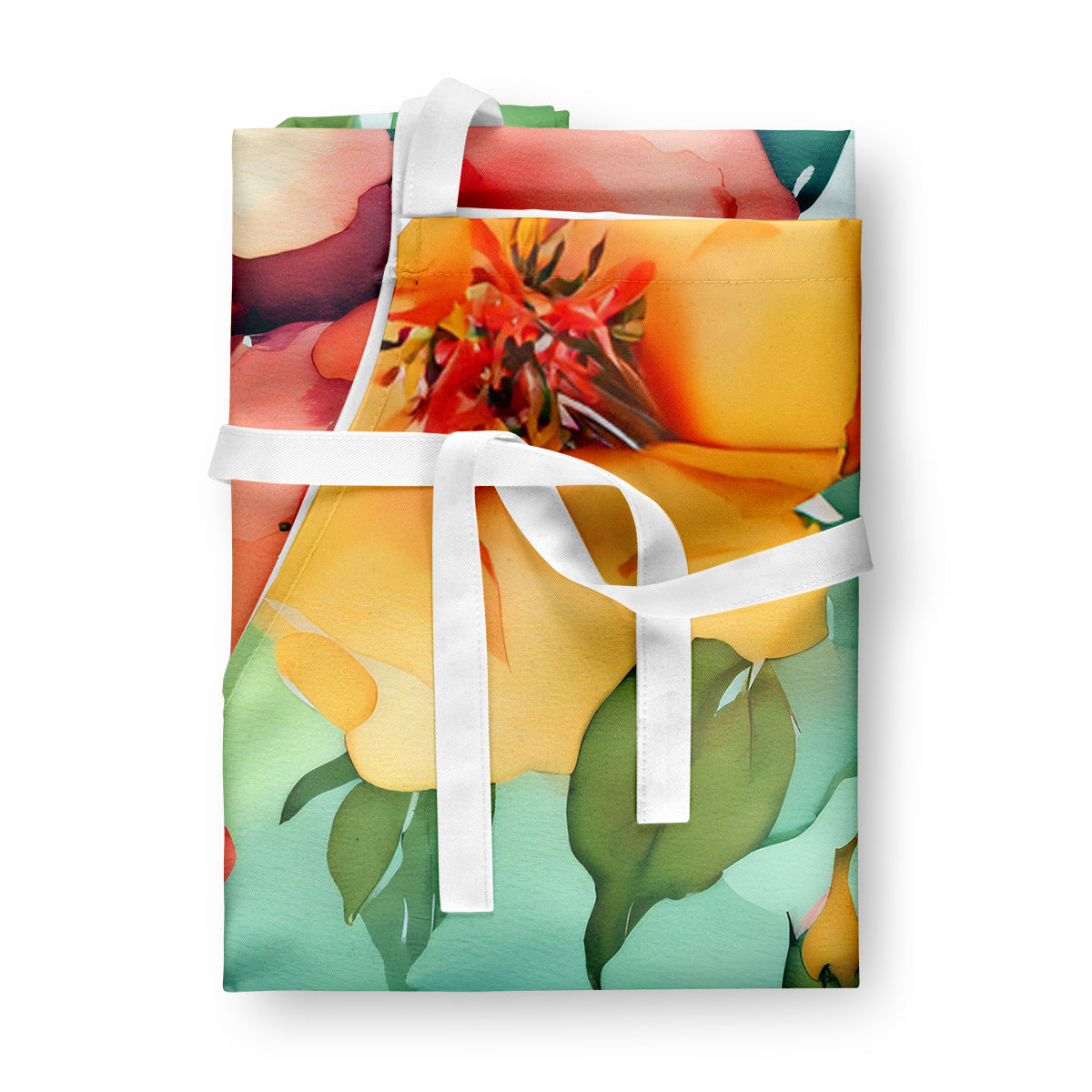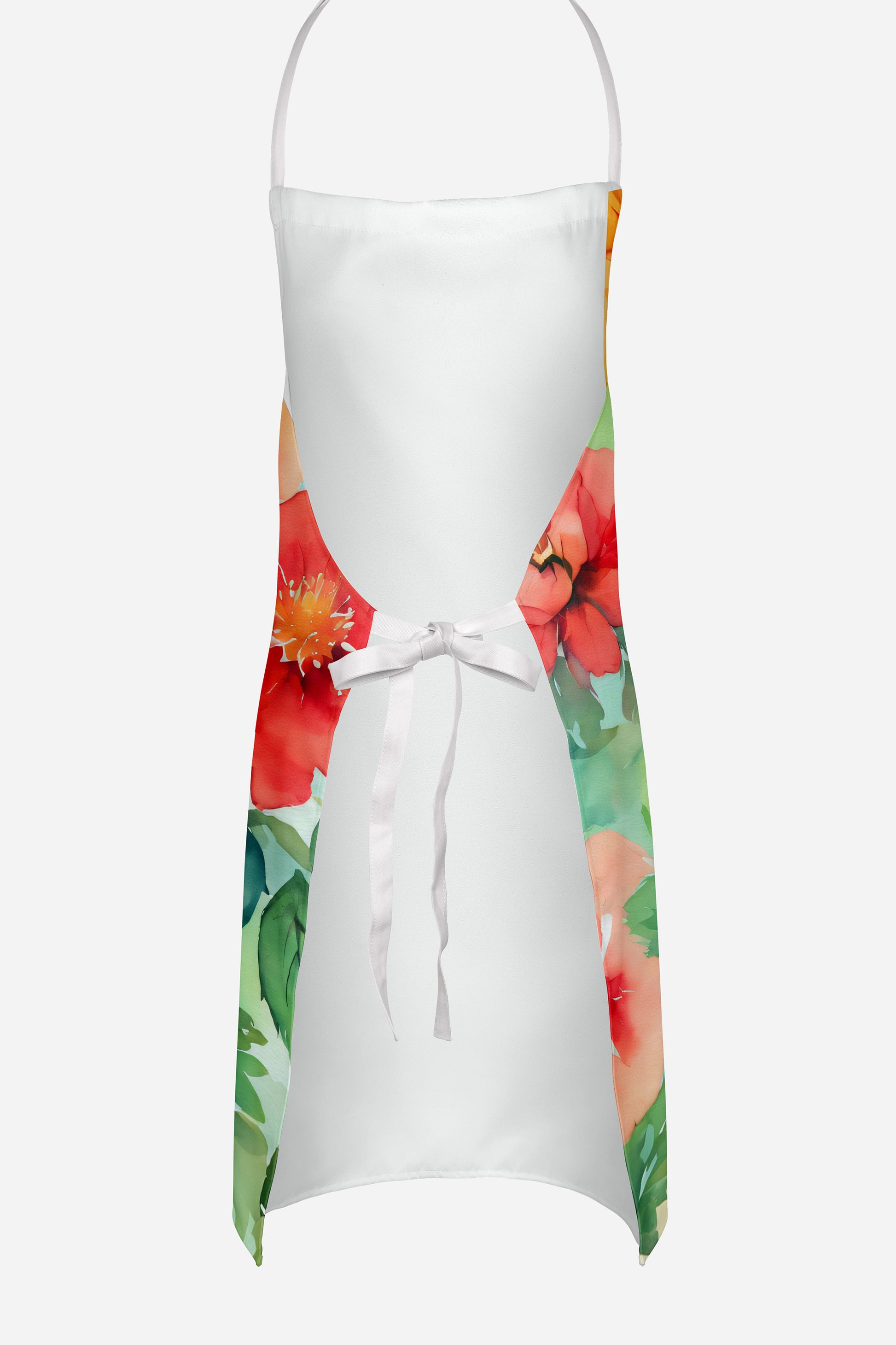 Apron featuring breed specific Georgia Cherokee Rose artwork. Elevate your cooking, baking, and grilling experiences with our versatile Kitchen or BBQ Apron. This Bib Style apron isn't just limited to culinary activities - it also serves as an excellent baking apron, artist apron, server apron, gardening apron, or even a dog grooming apron. The apron showcases vibrant full-color artwork contributed by one of our talented artists, bringing a dash of style to your daily tasks. With dimensions of approximately 27"W x 30"H, it provides ample coverage to protect your clothing from spills and splashes. Our apron is meticulously crafted from 100% Ultra Spun Polyester, known for its durability and lightweight nature. The apron comes with white tie straps, ensuring a comfortable and adjustable fit for all. It's a perfect choice for kitchen apron enthusiasts, whether you are a woman or a man. Designed for easy maintenance, this apron is fully machine washable. The quick-drying polyester material actively reduces staining, keeping your apron looking fresh and new for longer. Our beautifully designed apron isn't just a functional kitchen accessory - it's a fashion statement in the culinary world!
