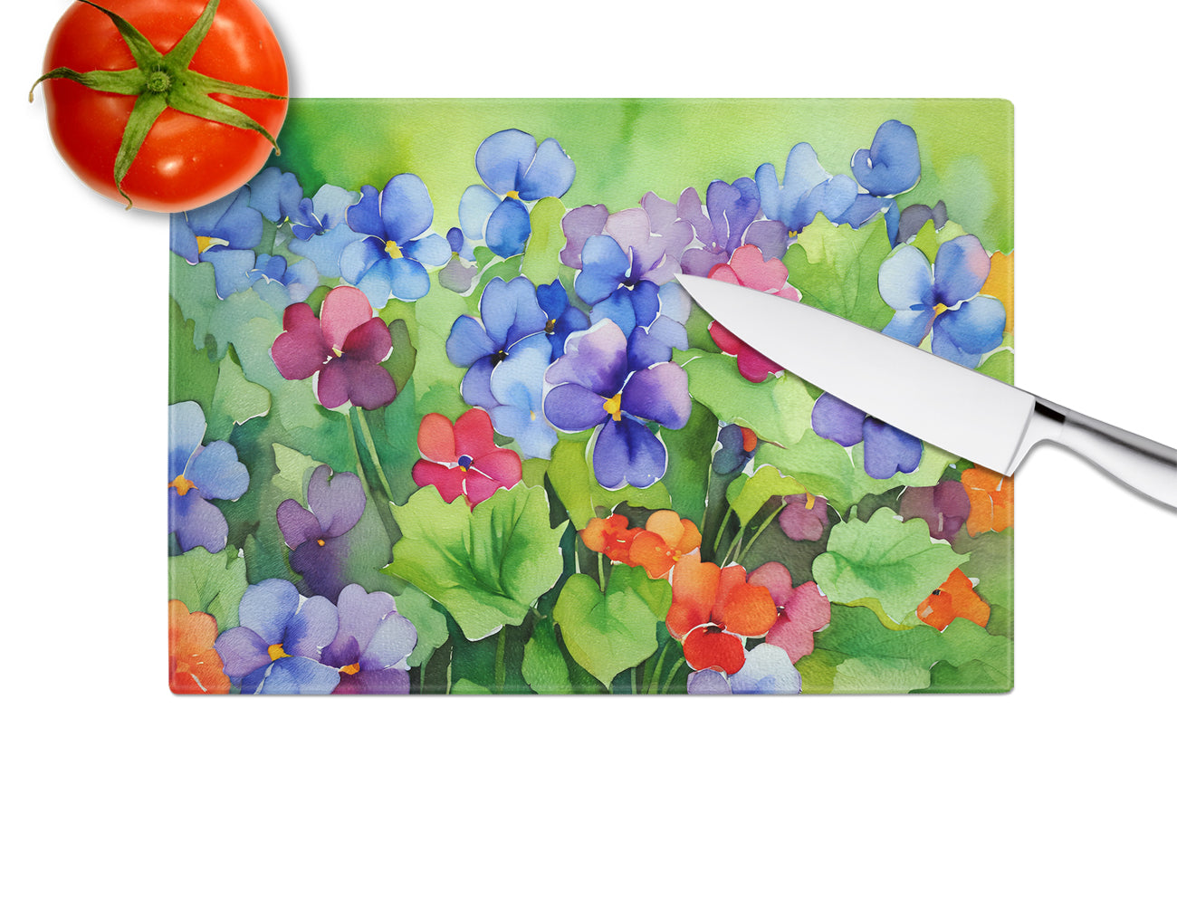 Glass Cutting Board featuring breed specific Illinois Violet artwork. Introduce your kitchen to the vibrant, large Decorative Glass Cutting Board from Caroline's Treasures. Crafted from resilient tempered glass, this board is not only a utilitarian necessity but also a colorful art piece. With its generous dimensions of 15 inches in height and 12 inches in length, it offers ample space for all your cutting needs. Every piece showcases captivating artwork from distinguished artists, bringing an aesthetic edge to your kitchen. Beyond its attractive design, this cutting board ensures your countertop stays pristine and unscathed, owing to its heat-resistant properties. Engineered with user convenience in mind, it features non-skid feet for stability, and rounded corners for additional safety. Its robust construction renders it virtually unbreakable, guaranteeing longevity. The board comes with protective feet bumpers, maintaining its position during use. This product is recommended to be hand washed only. Proudly printed and assembled in the United States, this cutting board exemplifies superior craftsmanship. With Caroline's Treasures' Decorative Glass Cutting Board, you're investing in a blend of functionality and artistic flair.