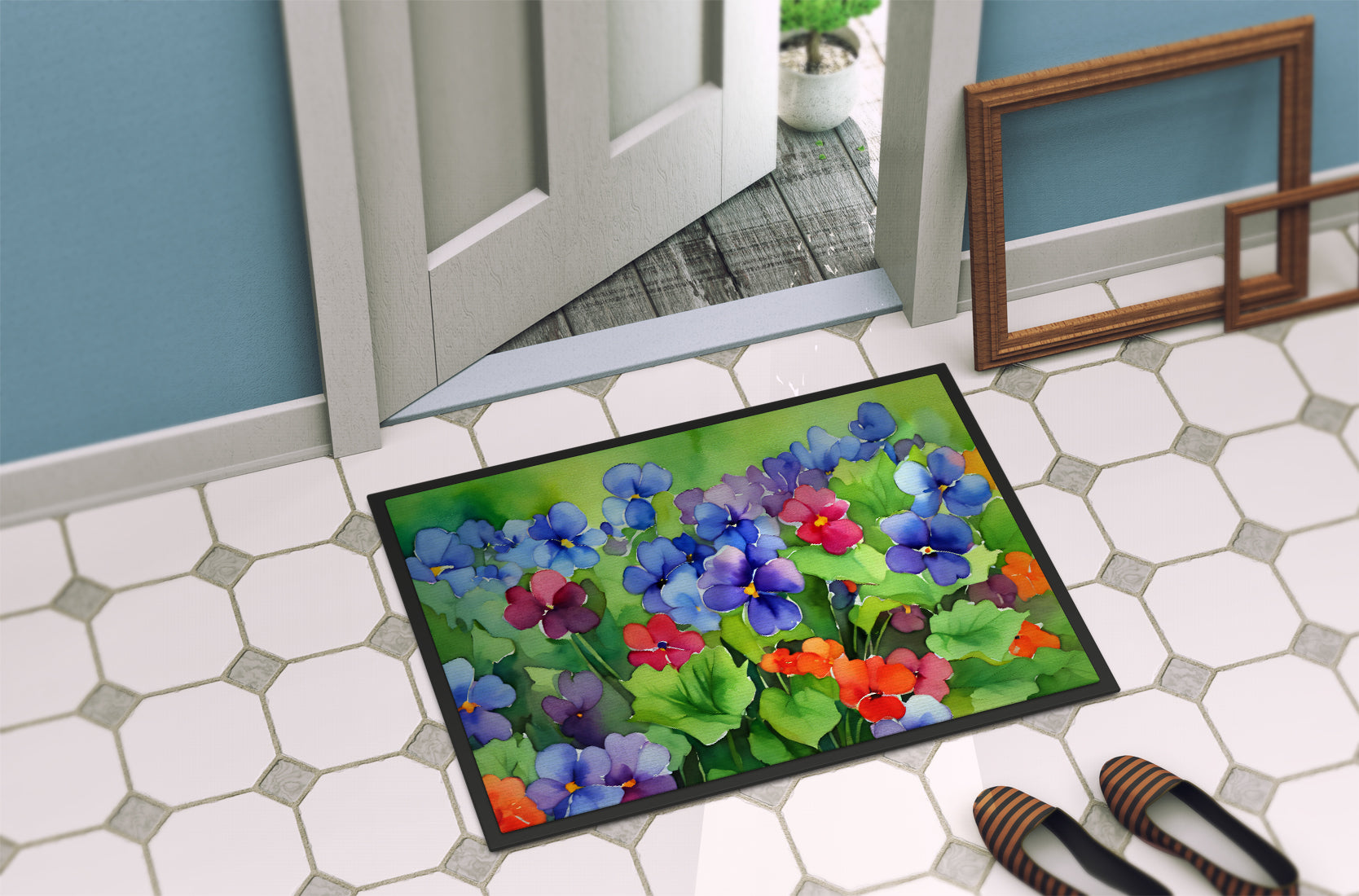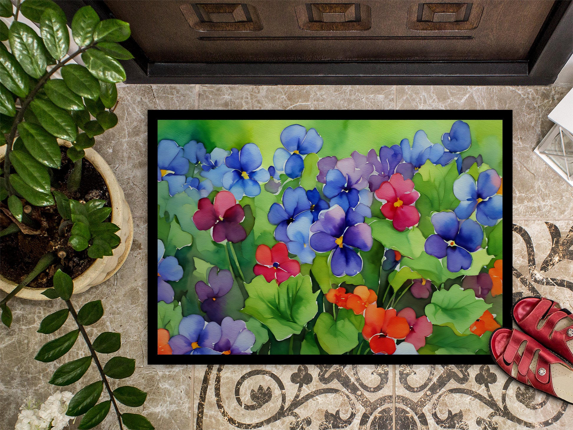 Doormat featuring breed specific Illinois Violet artwork. Welcome your guests in style with our Artwork Door Mat, designed to withstand almost any weather condition. This mat, measuring approximately 18 by 27 inches, is held together by durable black binding tape. Its top layer, composed of polyester felt, is dyed with the eye-catching image you see on the mat. A few layers below provide the mat with stability, while its rubber bottom is stamped to help prevent slipping and ensures safety. Our mat works wonderfully as both an indoor or outdoor door mat. For cleaning, simply hose it off with water or use a power washer - no need for any cleaner that produces suds. Avoid scrubbing with a brush, instead, opt for the vacuum on floor setting. Designed manufactured and printed in the USA, this mat is a perfect addition to your porch, outdoor kitchen, entryway, or any indoor space. Its unique design makes it a charming decorative rug that greets your guests and adds a stylish touch to your home decor.