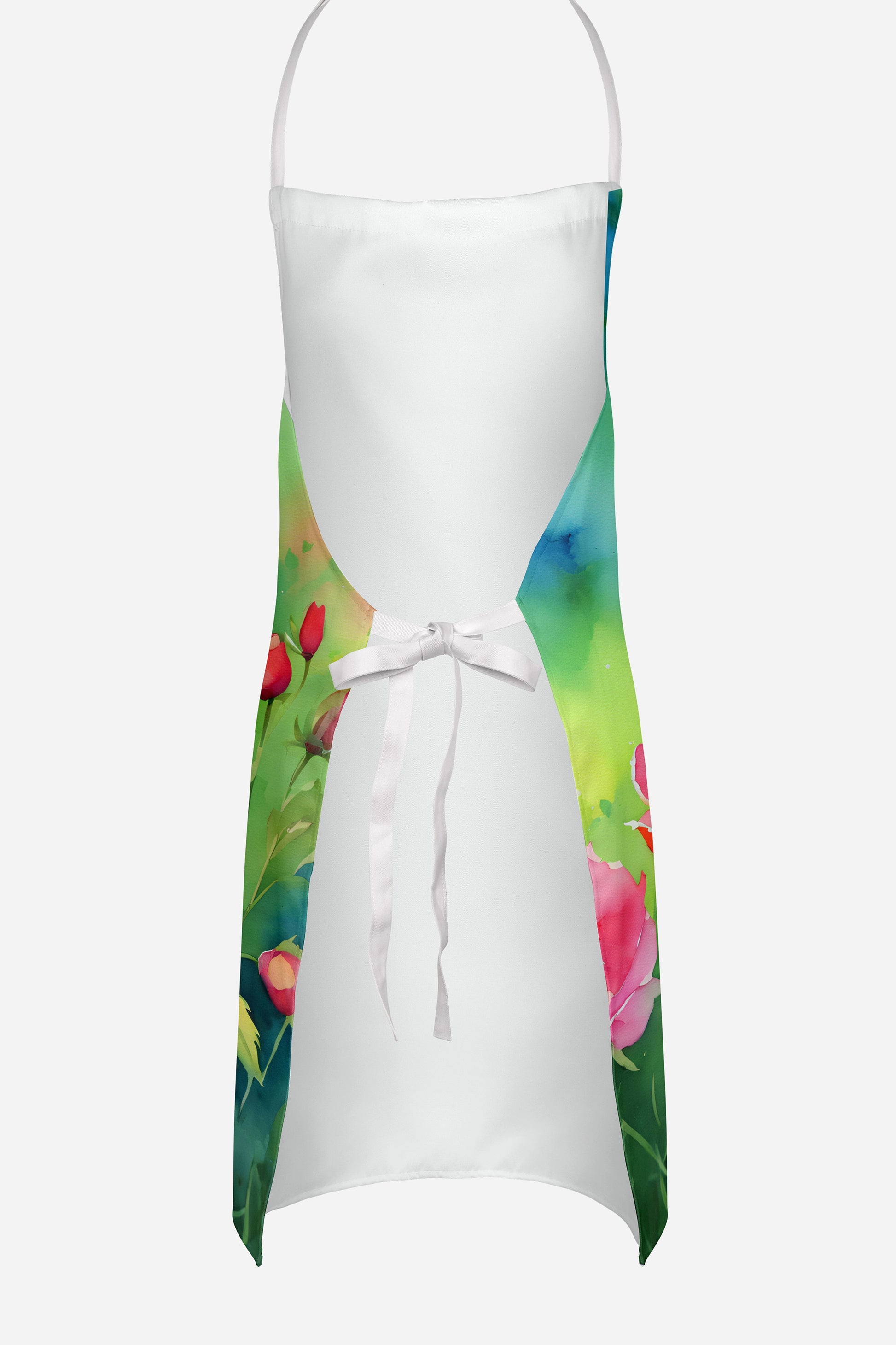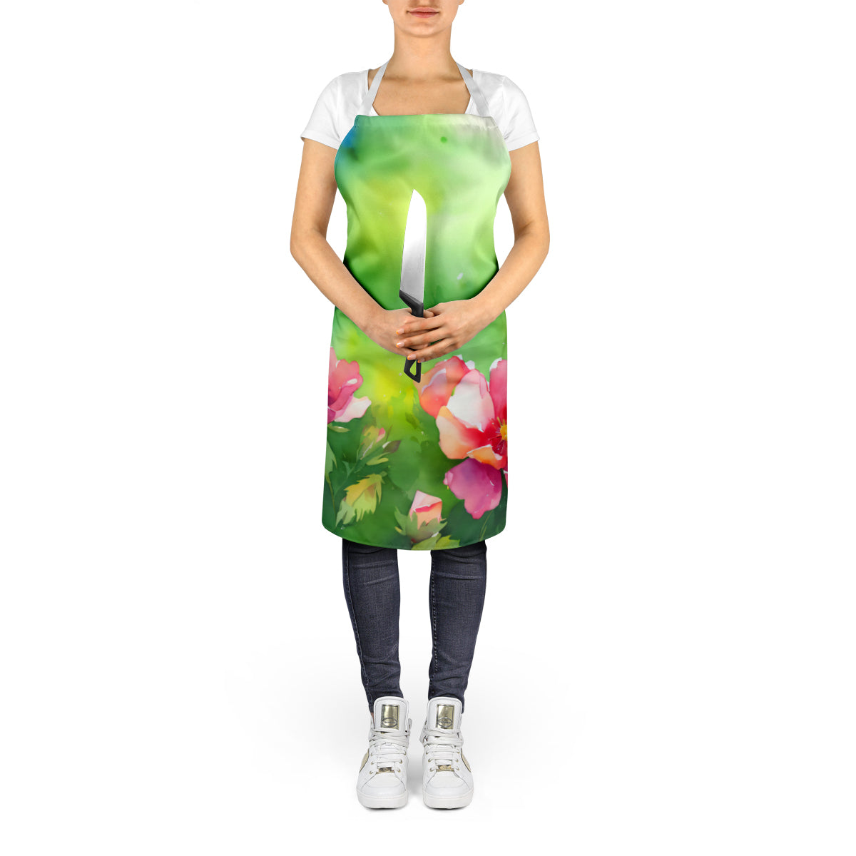 Apron featuring breed specific Iowa Wild Prairie Roses artwork. Elevate your cooking, baking, and grilling experiences with our versatile Kitchen or BBQ Apron. This Bib Style apron isn't just limited to culinary activities - it also serves as an excellent baking apron, artist apron, server apron, gardening apron, or even a dog grooming apron. The apron showcases vibrant full-color artwork contributed by one of our talented artists, bringing a dash of style to your daily tasks. With dimensions of approximately 27"W x 30"H, it provides ample coverage to protect your clothing from spills and splashes. Our apron is meticulously crafted from 100% Ultra Spun Polyester, known for its durability and lightweight nature. The apron comes with white tie straps, ensuring a comfortable and adjustable fit for all. It's a perfect choice for kitchen apron enthusiasts, whether you are a woman or a man. Designed for easy maintenance, this apron is fully machine washable. The quick-drying polyester material actively reduces staining, keeping your apron looking fresh and new for longer. Our beautifully designed apron isn't just a functional kitchen accessory - it's a fashion statement in the culinary world!