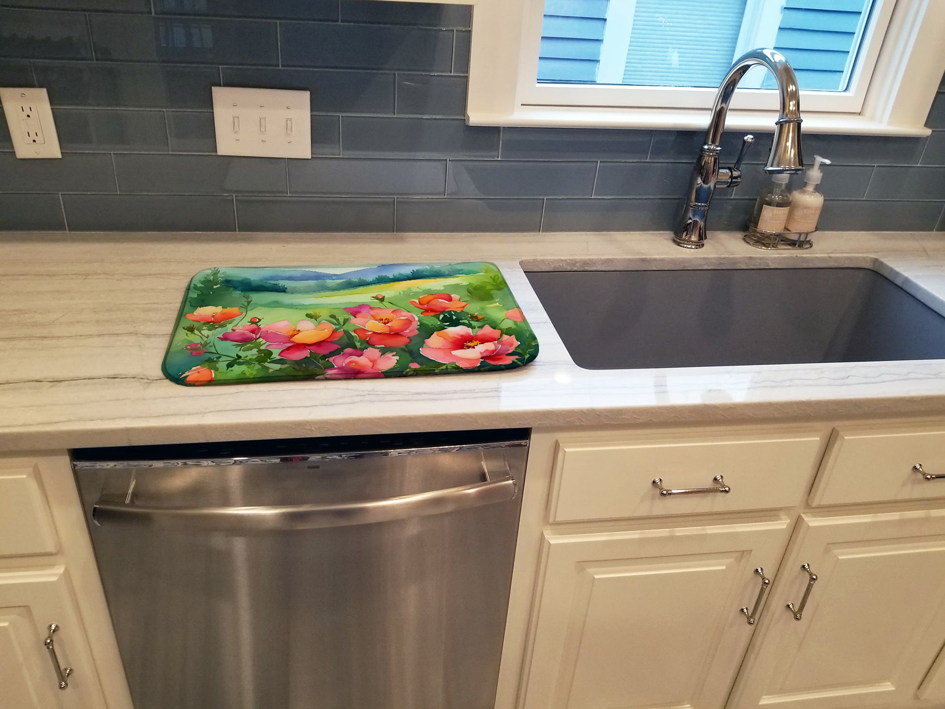 Dish Drying Mat featuring breed specific Iowa Wild Prairie Roses artwork. Say goodbye to messy countertops and soggy dish towels with our innovative dish drying mat. Our high-quality dish drying pad is designed to keep your countertops dry while offering a stylish and efficient solution. Whether you're air drying dishes, glasses, stemware, silverware, pots, pans, bottles, or even fruits and vegetables, our dish mat is the perfect choice. The 14 inches x 22 inches size fits most counters and dish drying racks, and the non-slip design ensures stability. Made with water-absorbent polyester and a polyurethane foam insert, our dish drying mat is not only functional but also durable. It's machine washable and printed in the USA for long-lasting use. The beautiful artwork adds flair to your kitchen decor, making it a perfect housewarming gift or present for any occasion. Upgrade your kitchen experience with our absorbent and versatile dish drying mat.