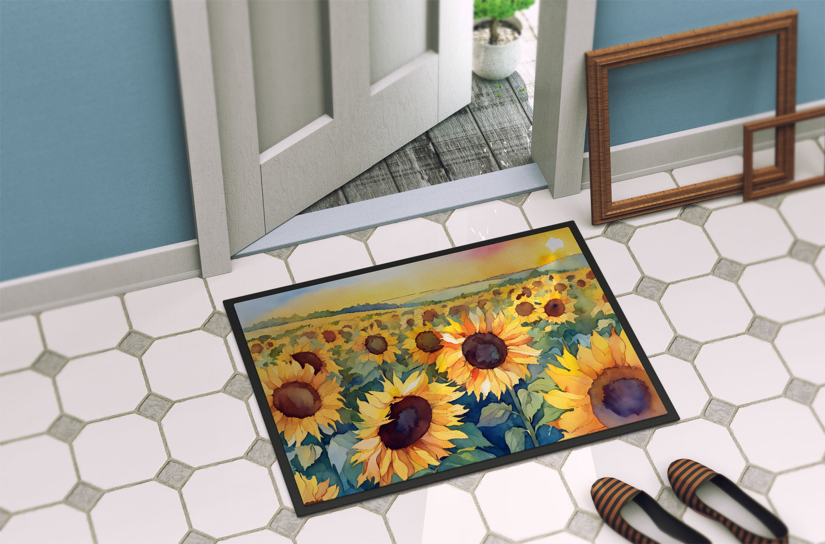 Doormat featuring breed specific Kansas Sunflowers artwork. Welcome your guests in style with our Artwork Door Mat, designed to withstand almost any weather condition. This mat, measuring approximately 18 by 27 inches, is held together by durable black binding tape. Its top layer, composed of polyester felt, is dyed with the eye-catching image you see on the mat. A few layers below provide the mat with stability, while its rubber bottom is stamped to help prevent slipping and ensures safety. Our mat works wonderfully as both an indoor or outdoor door mat. For cleaning, simply hose it off with water or use a power washer - no need for any cleaner that produces suds. Avoid scrubbing with a brush, instead, opt for the vacuum on floor setting. Designed manufactured and printed in the USA, this mat is a perfect addition to your porch, outdoor kitchen, entryway, or any indoor space. Its unique design makes it a charming decorative rug that greets your guests and adds a stylish touch to your home decor.