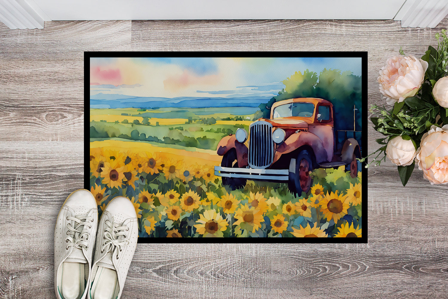 Doormat featuring breed specific Kansas Sunflowers artwork. Welcome your guests in style with our Artwork Door Mat, designed to withstand almost any weather condition. This mat, measuring approximately 24 by 36 inches, is held together by durable black binding tape. Its top layer, composed of polyester felt, is dyed with the eye-catching image you see on the mat. A few layers below provide the mat with stability, while its rubber bottom is stamped to help prevent slipping and ensures safety. Our mat works wonderfully as both an indoor or outdoor door mat. For cleaning, simply hose it off with water or use a power washer - no need for any cleaner that produces suds. Avoid scrubbing with a brush, instead, opt for the vacuum on floor setting. Designed manufactured and printed in the USA, this mat is a perfect addition to your porch, outdoor kitchen, entryway, or any indoor space. Its unique design makes it a charming decorative rug that greets your guests and adds a stylish touch to your home decor.