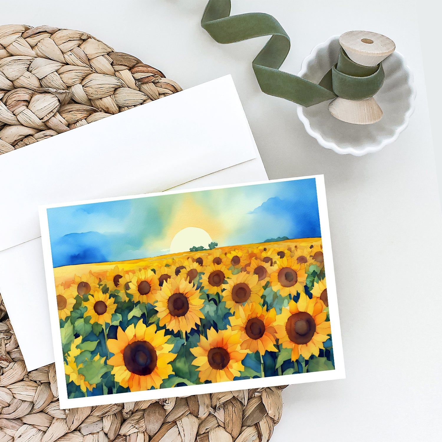 Greeting Cards Pack of 8 featuring breed specific Kansas Sunflowers artwork. Celebrate special moments with Caroline's Treasures Printed Greeting Card Pack. This pack includes eight beautifully folded 5x7 cards, accompanied by eight matching white envelopes. With blank interiors, these cards provide ample space for your personalized messages and heartfelt holiday greetings. Each card features captivating full-color artwork, meticulously printed in our facility on high-quality 80 lb cover stock or 216 GSM. The super smooth finish of the white cards enhances the visual impact of the artwork, creating a truly stunning presentation. Designed by our talented in-house artists or licensed artists, the artwork on these cards showcases their creativity and attention to detail. From vibrant illustrations to captivating designs, each card tells its own unique story. Whether it's for birthdays, anniversaries, holidays, or any special occasion, Caroline's Treasures Greeting Card Pack is the perfect way to convey your heartfelt sentiments. Share joy, love, and warm wishes with these exquisite cards and make every moment unforgettable.