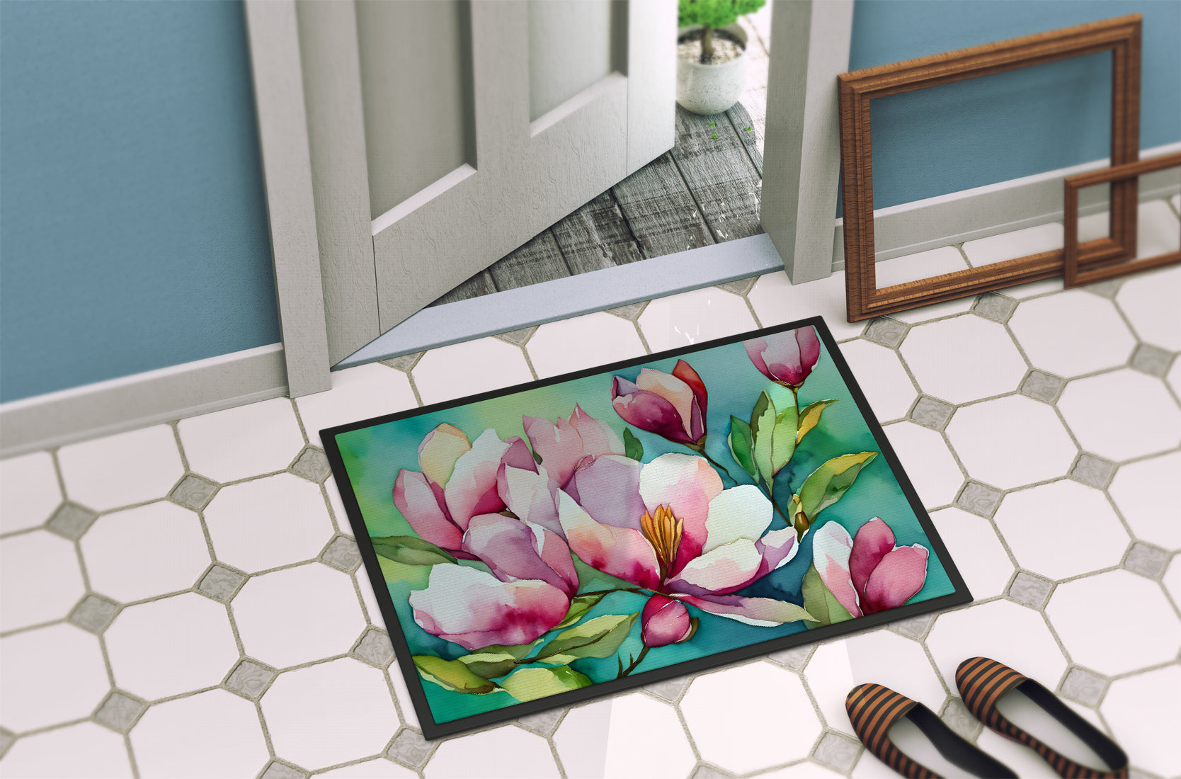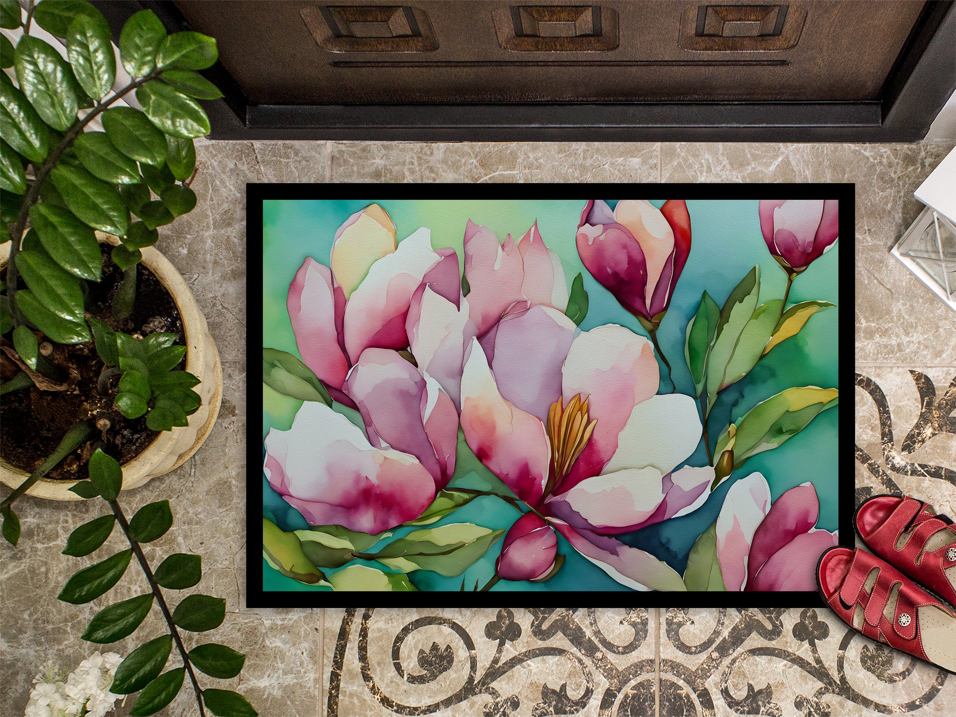 Doormat featuring breed specific Louisiana Magnolias artwork. Welcome your guests in style with our Artwork Door Mat, designed to withstand almost any weather condition. This mat, measuring approximately 18 by 27 inches, is held together by durable black binding tape. Its top layer, composed of polyester felt, is dyed with the eye-catching image you see on the mat. A few layers below provide the mat with stability, while its rubber bottom is stamped to help prevent slipping and ensures safety. Our mat works wonderfully as both an indoor or outdoor door mat. For cleaning, simply hose it off with water or use a power washer - no need for any cleaner that produces suds. Avoid scrubbing with a brush, instead, opt for the vacuum on floor setting. Designed manufactured and printed in the USA, this mat is a perfect addition to your porch, outdoor kitchen, entryway, or any indoor space. Its unique design makes it a charming decorative rug that greets your guests and adds a stylish touch to your home decor.