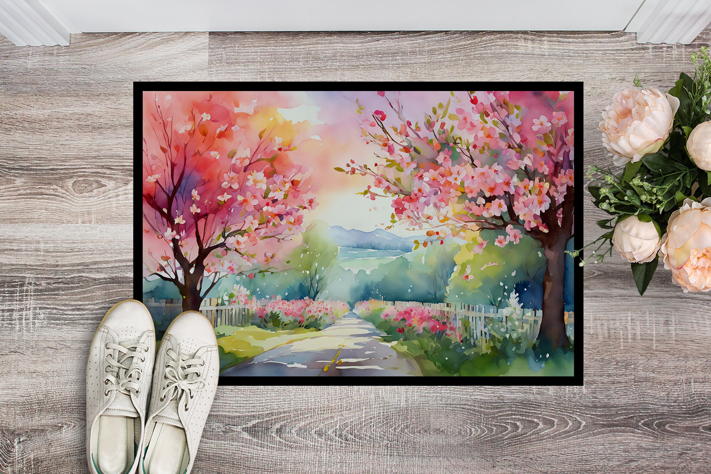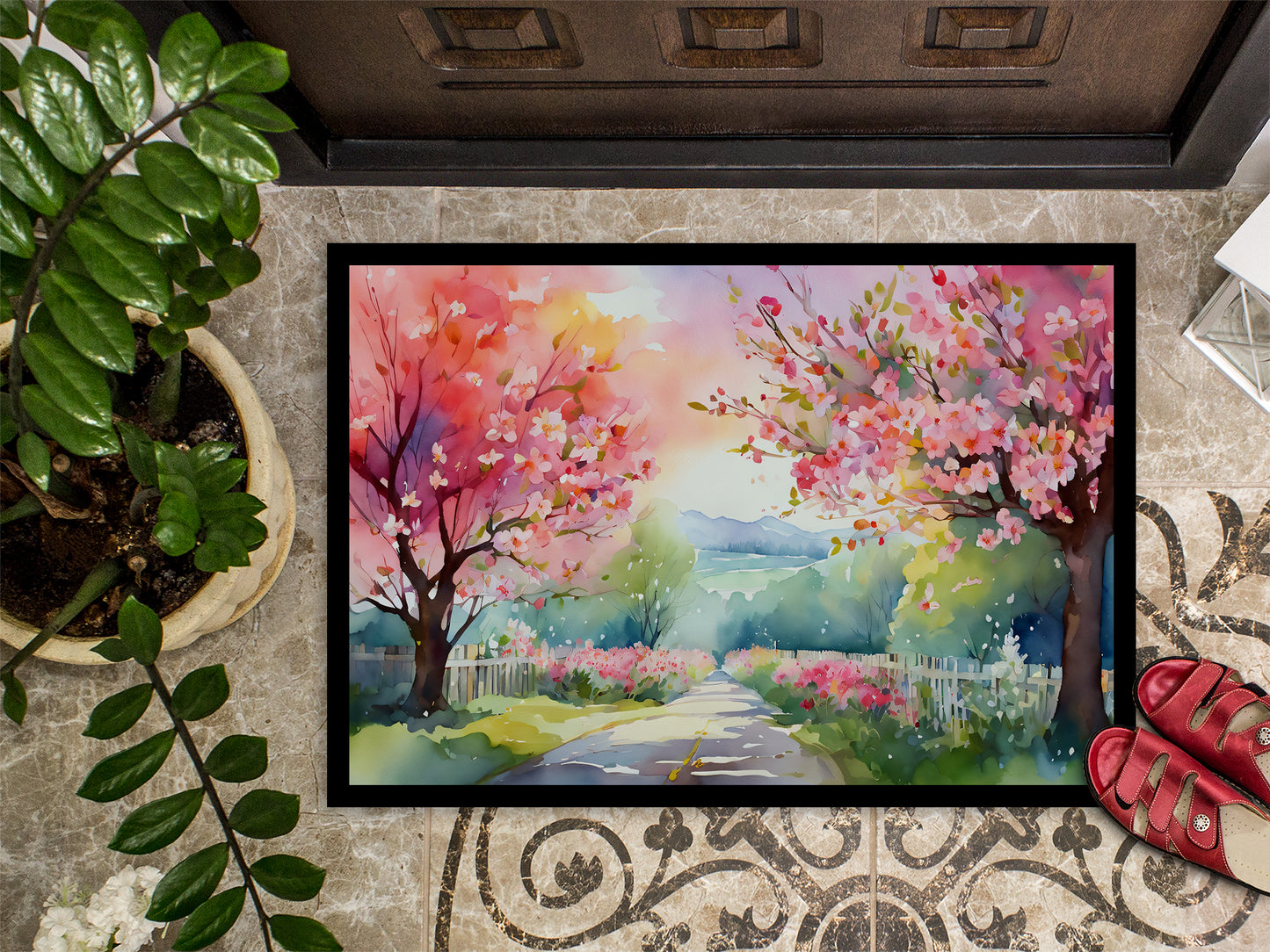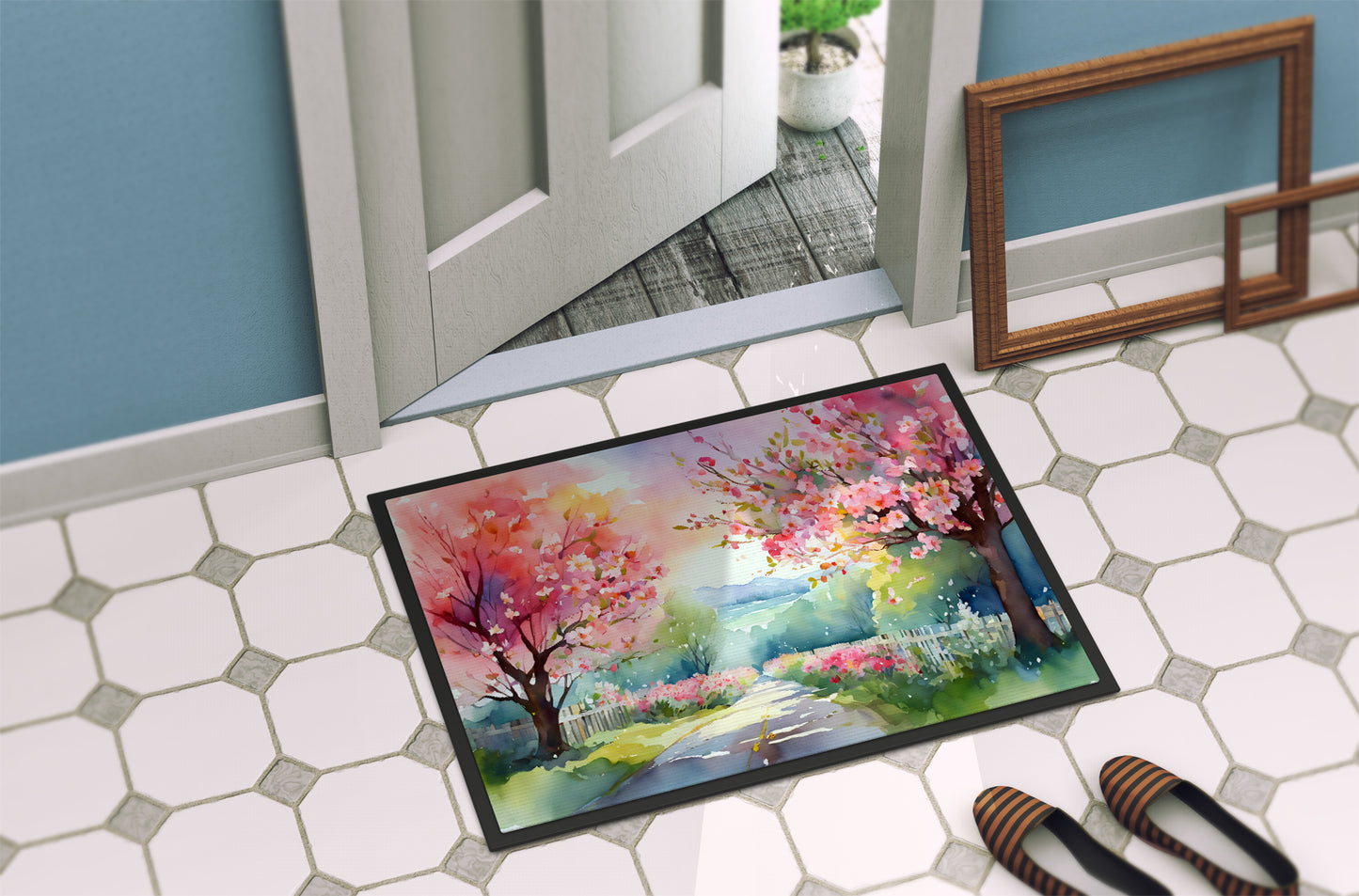 Doormat featuring breed specific Michigan Apple Blossoms artwork. Welcome your guests in style with our Artwork Door Mat, designed to withstand almost any weather condition. This mat, measuring approximately 18 by 27 inches, is held together by durable black binding tape. Its top layer, composed of polyester felt, is dyed with the eye-catching image you see on the mat. A few layers below provide the mat with stability, while its rubber bottom is stamped to help prevent slipping and ensures safety. Our mat works wonderfully as both an indoor or outdoor door mat. For cleaning, simply hose it off with water or use a power washer - no need for any cleaner that produces suds. Avoid scrubbing with a brush, instead, opt for the vacuum on floor setting. Designed manufactured and printed in the USA, this mat is a perfect addition to your porch, outdoor kitchen, entryway, or any indoor space. Its unique design makes it a charming decorative rug that greets your guests and adds a stylish touch to your home decor.