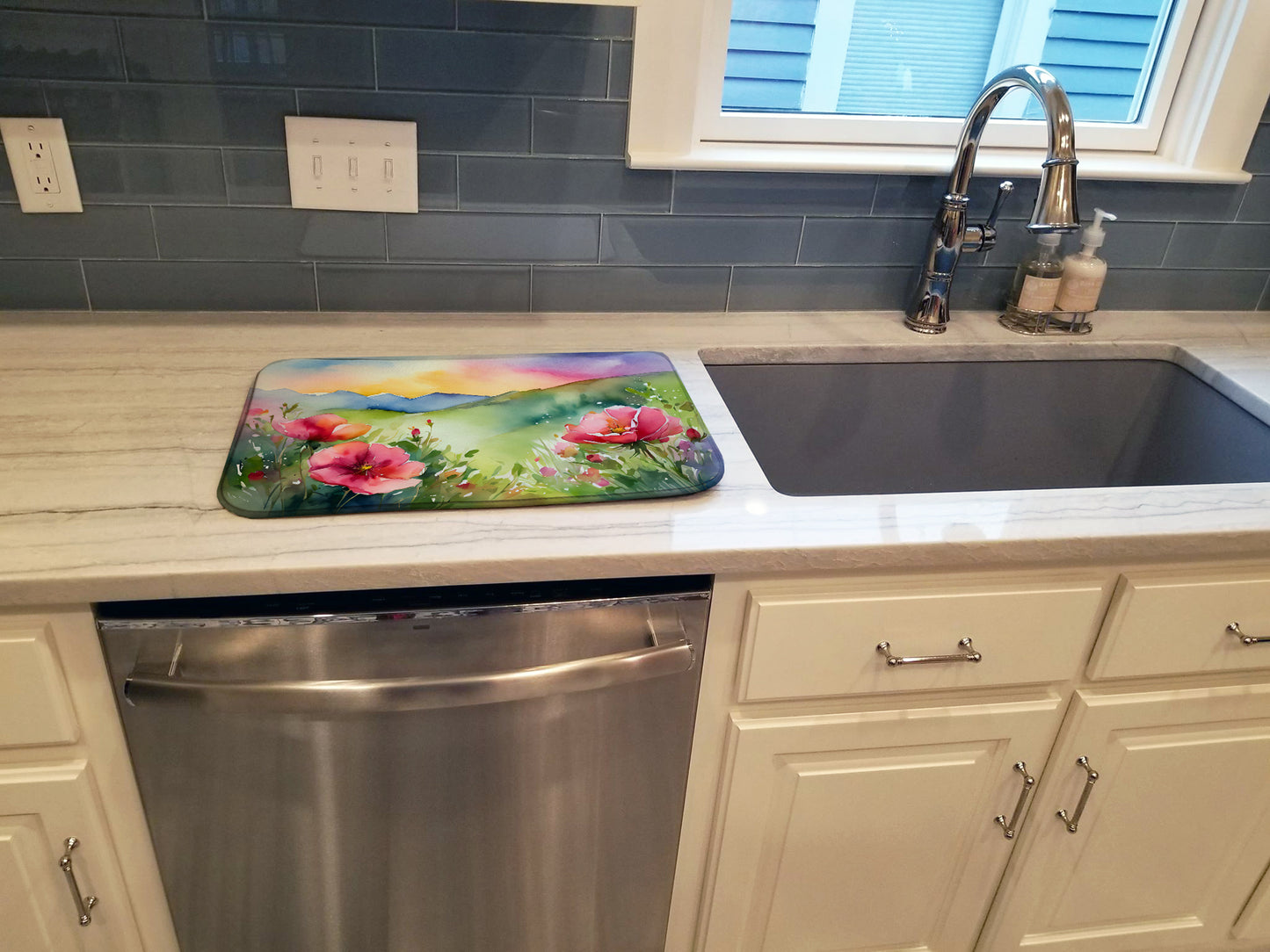 Dish Drying Mat featuring breed specific North Dakota Wild Prairie Roses artwork. Say goodbye to messy countertops and soggy dish towels with our innovative dish drying mat. Our high-quality dish drying pad is designed to keep your countertops dry while offering a stylish and efficient solution. Whether you're air drying dishes, glasses, stemware, silverware, pots, pans, bottles, or even fruits and vegetables, our dish mat is the perfect choice. The 14 inches x 22 inches size fits most counters and dish drying racks, and the non-slip design ensures stability. Made with water-absorbent polyester and a polyurethane foam insert, our dish drying mat is not only functional but also durable. It's machine washable and printed in the USA for long-lasting use. The beautiful artwork adds flair to your kitchen decor, making it a perfect housewarming gift or present for any occasion. Upgrade your kitchen experience with our absorbent and versatile dish drying mat.