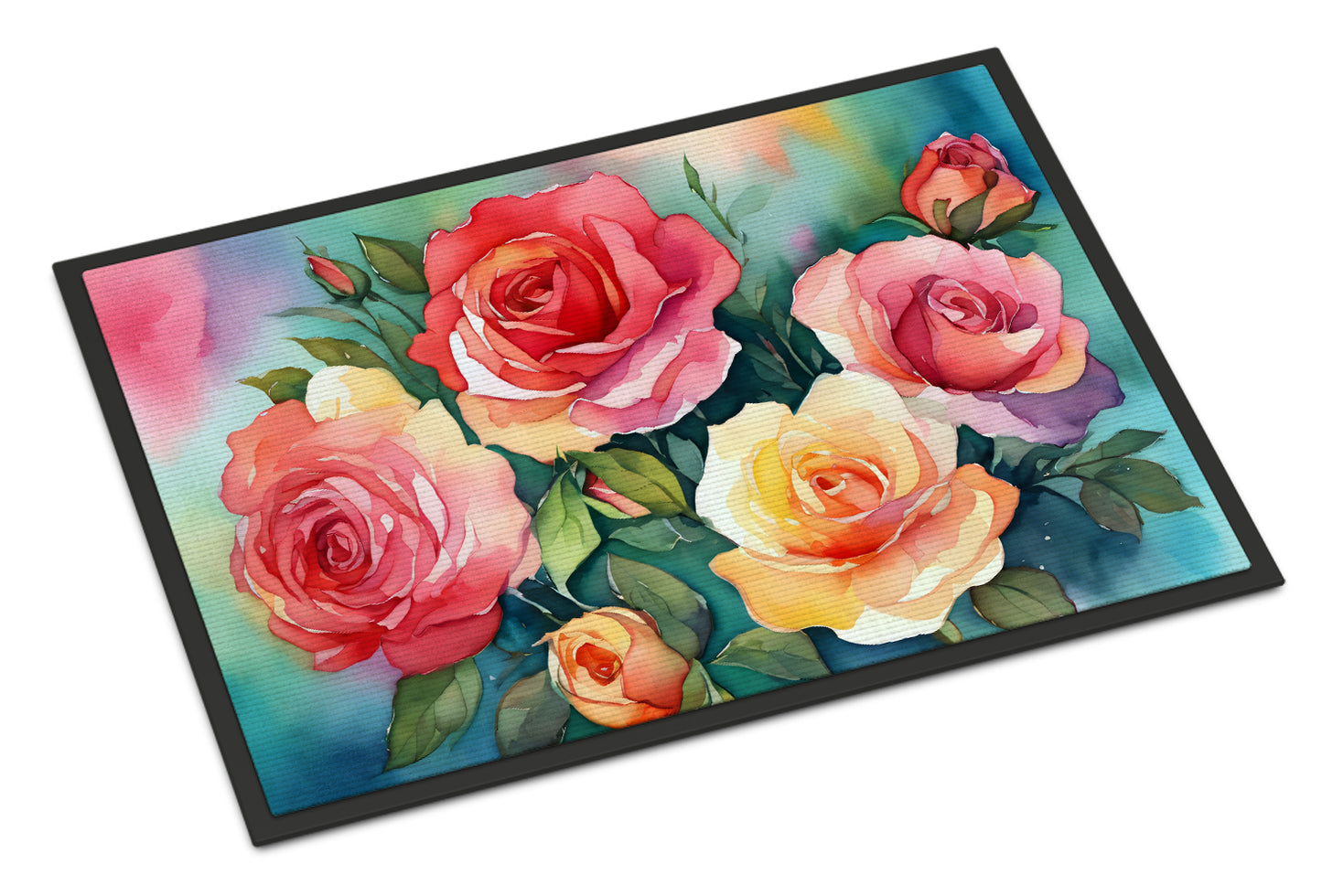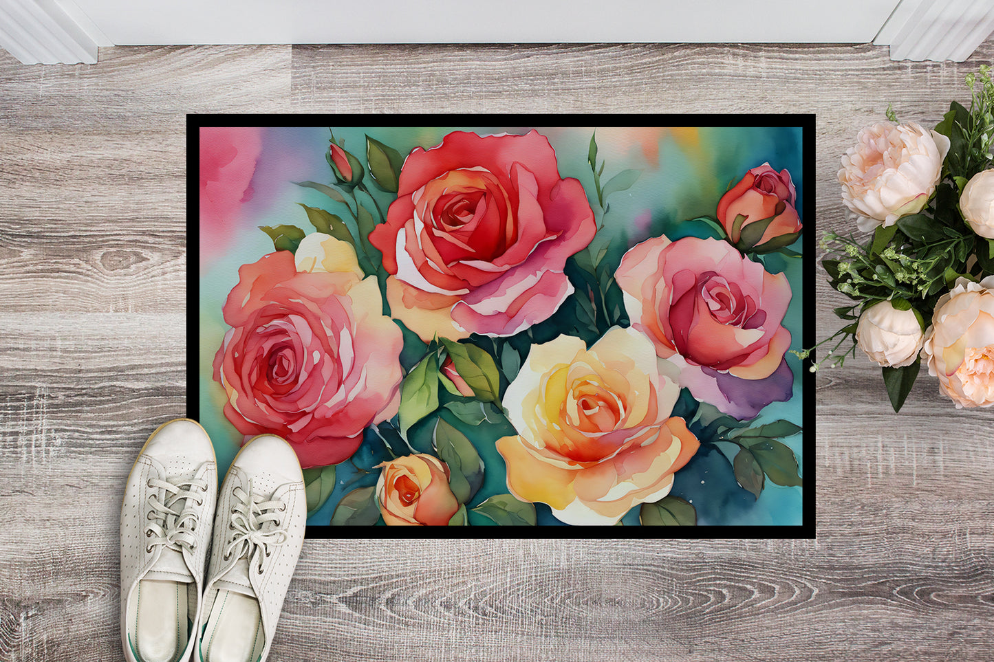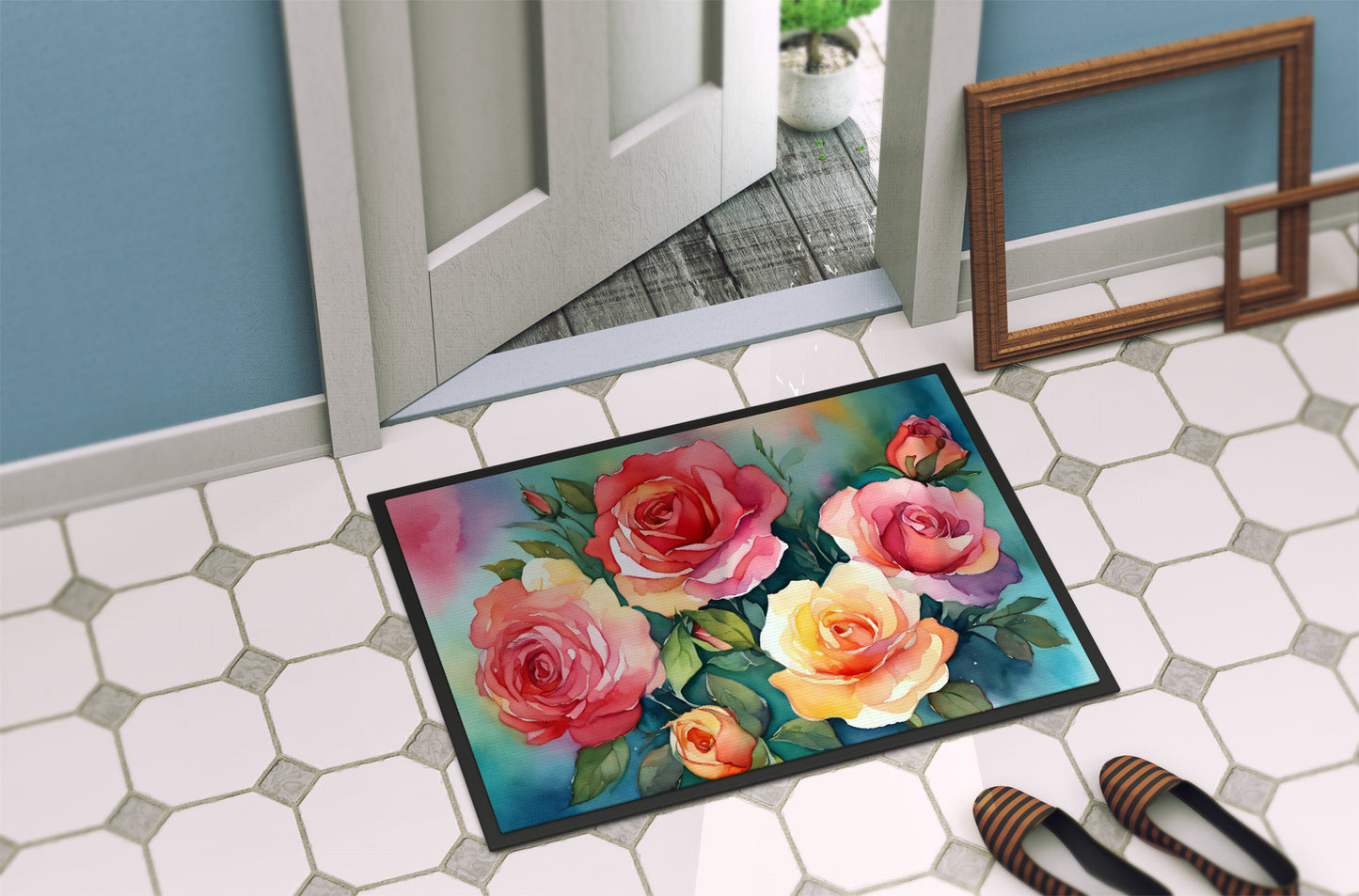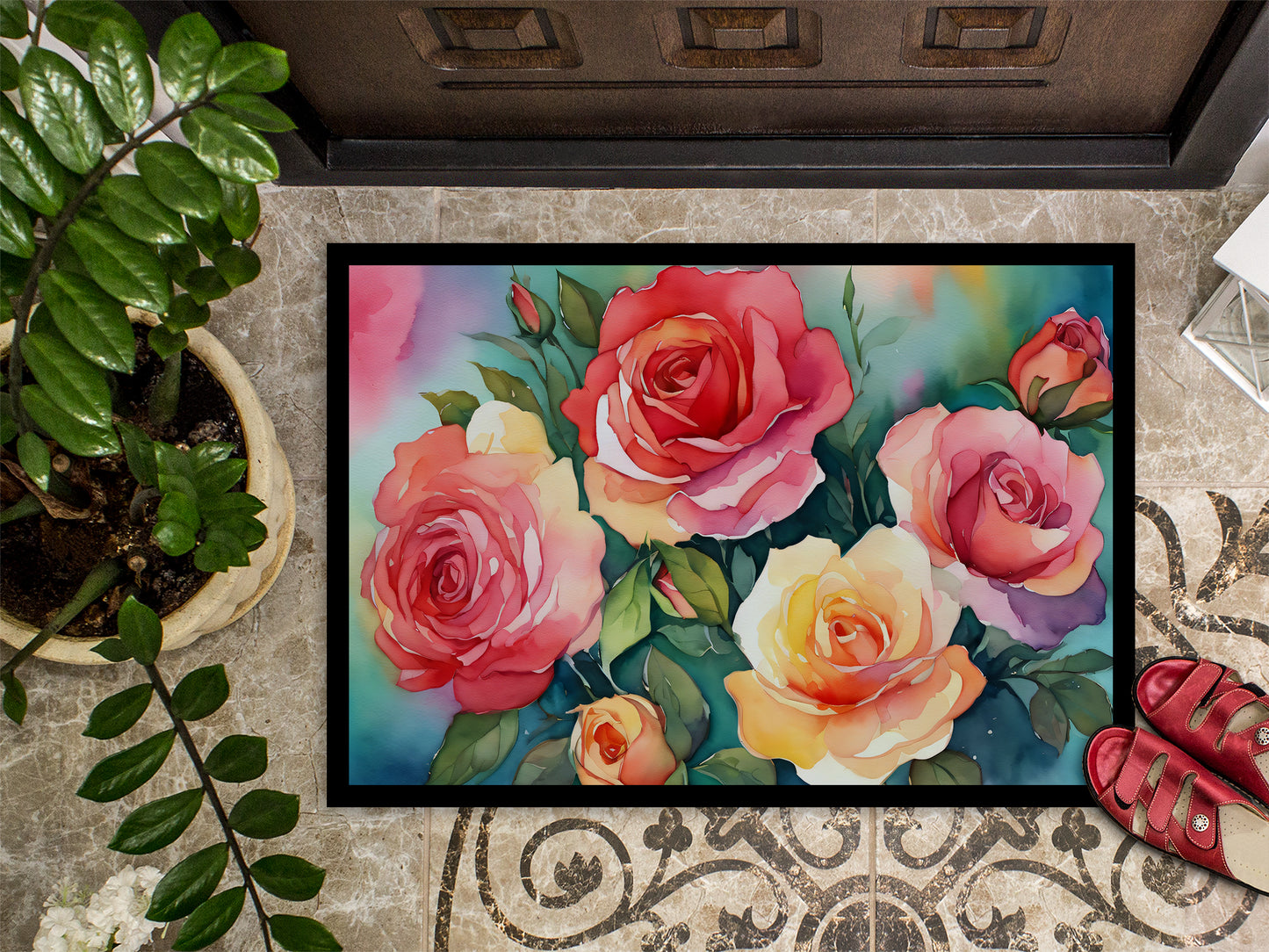Doormat featuring breed specific Oklahoma Roses artwork. Welcome your guests in style with our Artwork Door Mat, designed to withstand almost any weather condition. This mat, measuring approximately 24 by 36 inches, is held together by durable black binding tape. Its top layer, composed of polyester felt, is dyed with the eye-catching image you see on the mat. A few layers below provide the mat with stability, while its rubber bottom is stamped to help prevent slipping and ensures safety. Our mat works wonderfully as both an indoor or outdoor door mat. For cleaning, simply hose it off with water or use a power washer - no need for any cleaner that produces suds. Avoid scrubbing with a brush, instead, opt for the vacuum on floor setting. Designed manufactured and printed in the USA, this mat is a perfect addition to your porch, outdoor kitchen, entryway, or any indoor space. Its unique design makes it a charming decorative rug that greets your guests and adds a stylish touch to your home decor.