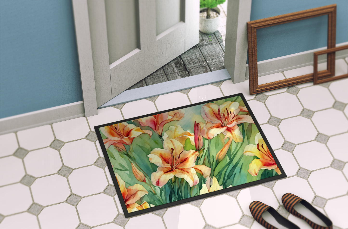 Doormat featuring breed specific Utah Sego Lilies artwork. Welcome your guests in style with our Artwork Door Mat, designed to withstand almost any weather condition. This mat, measuring approximately 18 by 27 inches, is held together by durable black binding tape. Its top layer, composed of polyester felt, is dyed with the eye-catching image you see on the mat. A few layers below provide the mat with stability, while its rubber bottom is stamped to help prevent slipping and ensures safety. Our mat works wonderfully as both an indoor or outdoor door mat. For cleaning, simply hose it off with water or use a power washer - no need for any cleaner that produces suds. Avoid scrubbing with a brush, instead, opt for the vacuum on floor setting. Designed manufactured and printed in the USA, this mat is a perfect addition to your porch, outdoor kitchen, entryway, or any indoor space. Its unique design makes it a charming decorative rug that greets your guests and adds a stylish touch to your home decor.