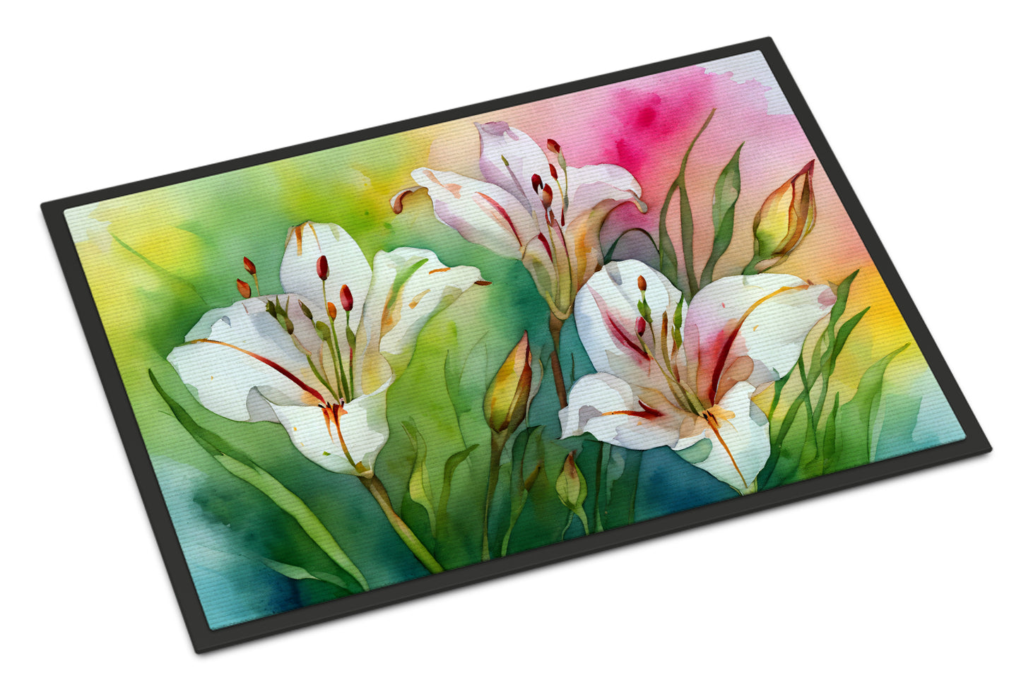 Doormat featuring breed specific Utah Sego Lilies artwork. Welcome your guests in style with our Artwork Door Mat, designed to withstand almost any weather condition. This mat, measuring approximately 18 by 27 inches, is held together by durable black binding tape. Its top layer, composed of polyester felt, is dyed with the eye-catching image you see on the mat. A few layers below provide the mat with stability, while its rubber bottom is stamped to help prevent slipping and ensures safety. Our mat works wonderfully as both an indoor or outdoor door mat. For cleaning, simply hose it off with water or use a power washer - no need for any cleaner that produces suds. Avoid scrubbing with a brush, instead, opt for the vacuum on floor setting. Designed manufactured and printed in the USA, this mat is a perfect addition to your porch, outdoor kitchen, entryway, or any indoor space. Its unique design makes it a charming decorative rug that greets your guests and adds a stylish touch to your home decor.