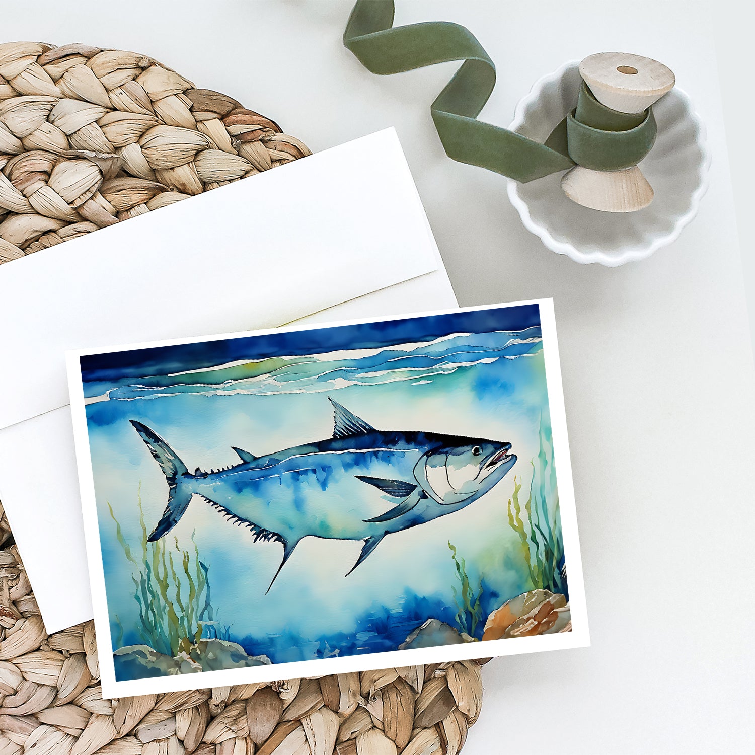 Greeting Cards Pack of 8 featuring breed specific Bluefin Tuna artwork. Celebrate special moments with Caroline's Treasures Printed Greeting Card Pack. This pack includes eight beautifully folded 5x7 cards, accompanied by eight matching white envelopes. With blank interiors, these cards provide ample space for your personalized messages and heartfelt holiday greetings. Each card features captivating full-color artwork, meticulously printed in our facility on high-quality 80 lb cover stock or 216 GSM. The super smooth finish of the white cards enhances the visual impact of the artwork, creating a truly stunning presentation. Designed by our talented in-house artists or licensed artists, the artwork on these cards showcases their creativity and attention to detail. From vibrant illustrations to captivating designs, each card tells its own unique story. Whether it's for birthdays, anniversaries, holidays, or any special occasion, Caroline's Treasures Greeting Card Pack is the perfect way to convey your heartfelt sentiments. Share joy, love, and warm wishes with these exquisite cards and make every moment unforgettable.