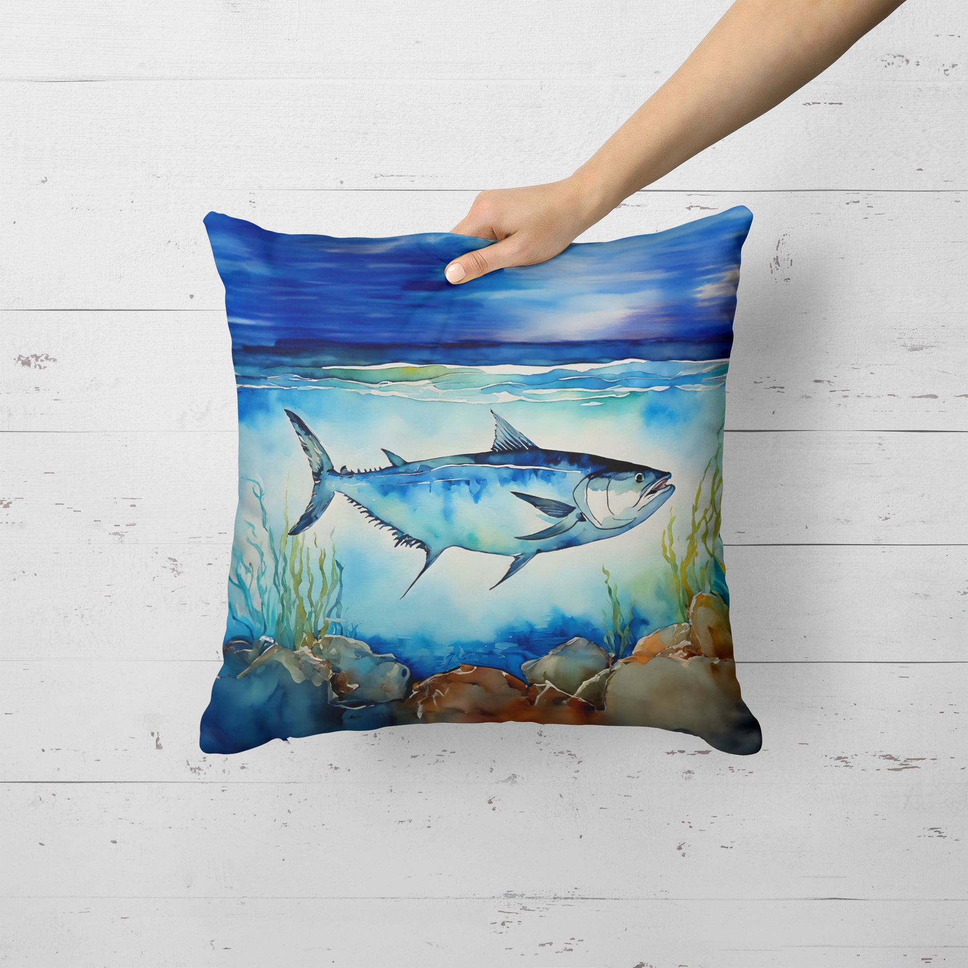Throw Pillow featuring breed specific Bluefin Tuna artwork. Revitalize your outdoor or indoor living space with Caroline's Treasures 18x18 Fabric Decorative Pillow. With a generously sized dimension of approximately 18 inches by 18 inches, this pillow makes a comfortable and aesthetic addition to any seating area. Made from a unique, water-resistant material developed by Caroline's Treasures, the pillow sham is 100% polyester fabric that's durable and ready to weather any condition. Its vibrant, full-color artwork will not fade over time as it is dyed with color-fast dyes. Whether you place it on your patio furniture, porch, veranda, or indoor couch, its soft canvas fabric ensures a cozy experience. The pillow is handcrafted in the United States, featuring a sham created from three pieces of fabric and a polyester insert for enduring shape and overstuffed comfort. Despite being robustly built to endure the outdoors, it is as soft and snug as your favorite indoor cushions. Please note, as all our pillows are handmade, sizes may vary slightly, adding to the charm of this unique decorative item.