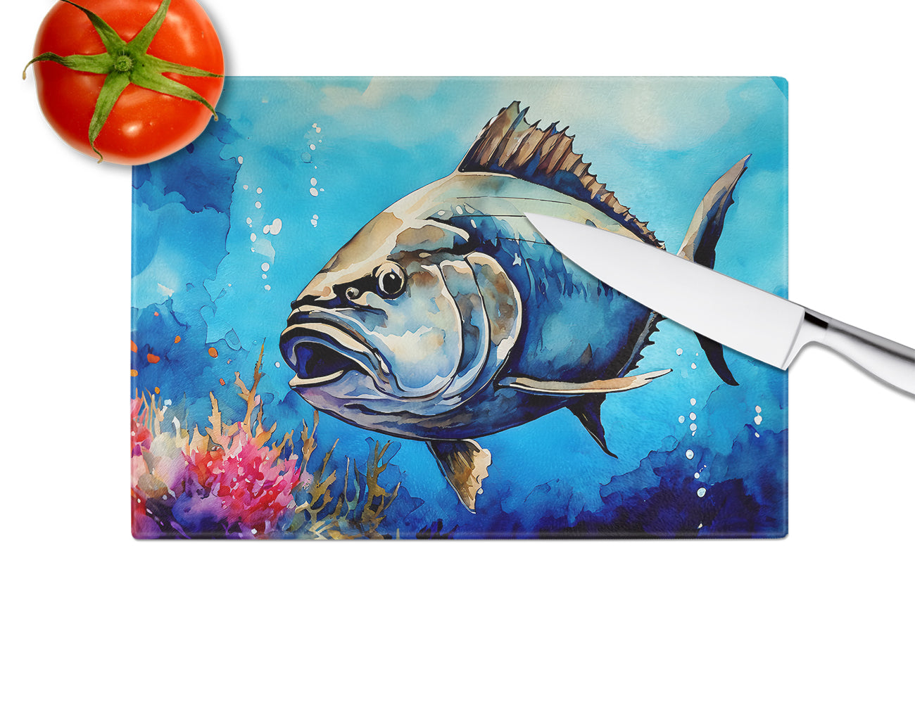 Glass Cutting Board featuring breed specific Bluefin Tuna artwork. Introduce your kitchen to the vibrant, large Decorative Glass Cutting Board from Caroline's Treasures. Crafted from resilient tempered glass, this board is not only a utilitarian necessity but also a colorful art piece. With its generous dimensions of 15 inches in height and 12 inches in length, it offers ample space for all your cutting needs. Every piece showcases captivating artwork from distinguished artists, bringing an aesthetic edge to your kitchen. Beyond its attractive design, this cutting board ensures your countertop stays pristine and unscathed, owing to its heat-resistant properties. Engineered with user convenience in mind, it features non-skid feet for stability, and rounded corners for additional safety. Its robust construction renders it virtually unbreakable, guaranteeing longevity. The board comes with protective feet bumpers, maintaining its position during use. This product is recommended to be hand washed only. Proudly printed and assembled in the United States, this cutting board exemplifies superior craftsmanship. With Caroline's Treasures' Decorative Glass Cutting Board, you're investing in a blend of functionality and artistic flair.