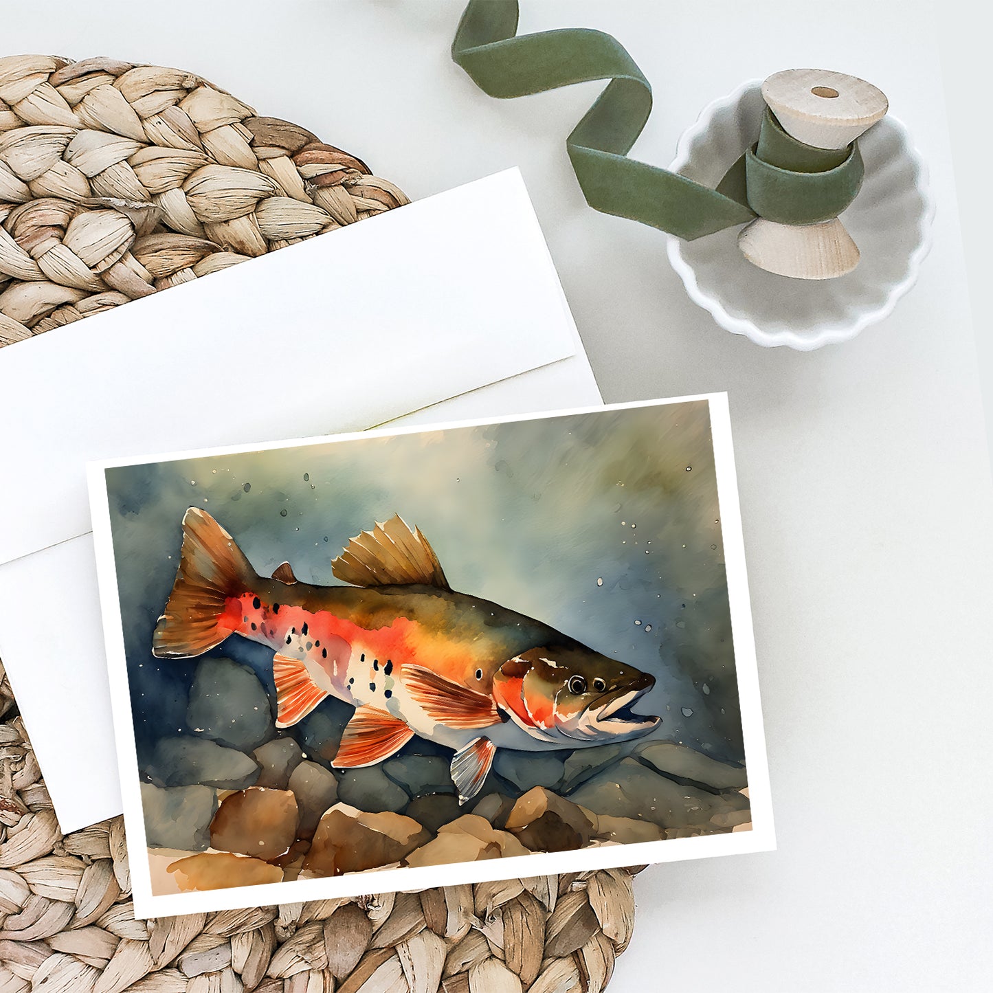 Greeting Cards Pack of 8 featuring breed specific Brook Trout artwork. Celebrate special moments with Caroline's Treasures Printed Greeting Card Pack. This pack includes eight beautifully folded 5x7 cards, accompanied by eight matching white envelopes. With blank interiors, these cards provide ample space for your personalized messages and heartfelt holiday greetings. Each card features captivating full-color artwork, meticulously printed in our facility on high-quality 80 lb cover stock or 216 GSM. The super smooth finish of the white cards enhances the visual impact of the artwork, creating a truly stunning presentation. Designed by our talented in-house artists or licensed artists, the artwork on these cards showcases their creativity and attention to detail. From vibrant illustrations to captivating designs, each card tells its own unique story. Whether it's for birthdays, anniversaries, holidays, or any special occasion, Caroline's Treasures Greeting Card Pack is the perfect way to convey your heartfelt sentiments. Share joy, love, and warm wishes with these exquisite cards and make every moment unforgettable.