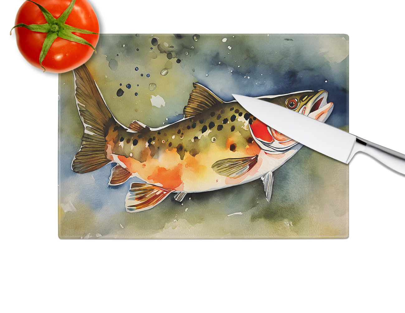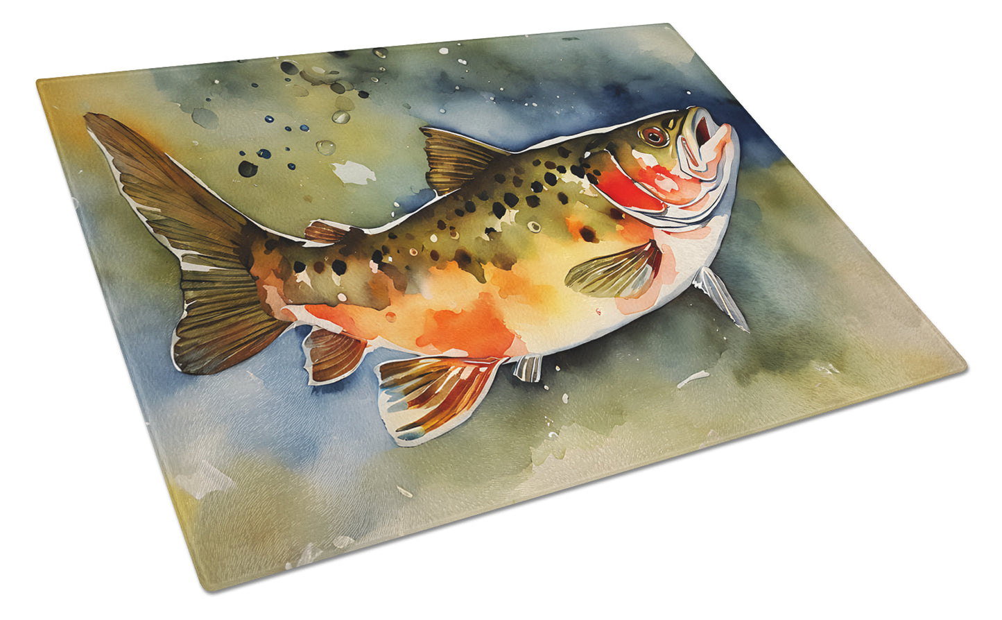 Glass Cutting Board featuring breed specific Brook Trout artwork. Introduce your kitchen to the vibrant, large Decorative Glass Cutting Board from Caroline's Treasures. Crafted from resilient tempered glass, this board is not only a utilitarian necessity but also a colorful art piece. With its generous dimensions of 15 inches in height and 12 inches in length, it offers ample space for all your cutting needs. Every piece showcases captivating artwork from distinguished artists, bringing an aesthetic edge to your kitchen. Beyond its attractive design, this cutting board ensures your countertop stays pristine and unscathed, owing to its heat-resistant properties. Engineered with user convenience in mind, it features non-skid feet for stability, and rounded corners for additional safety. Its robust construction renders it virtually unbreakable, guaranteeing longevity. The board comes with protective feet bumpers, maintaining its position during use. This product is recommended to be hand washed only. Proudly printed and assembled in the United States, this cutting board exemplifies superior craftsmanship. With Caroline's Treasures' Decorative Glass Cutting Board, you're investing in a blend of functionality and artistic flair.