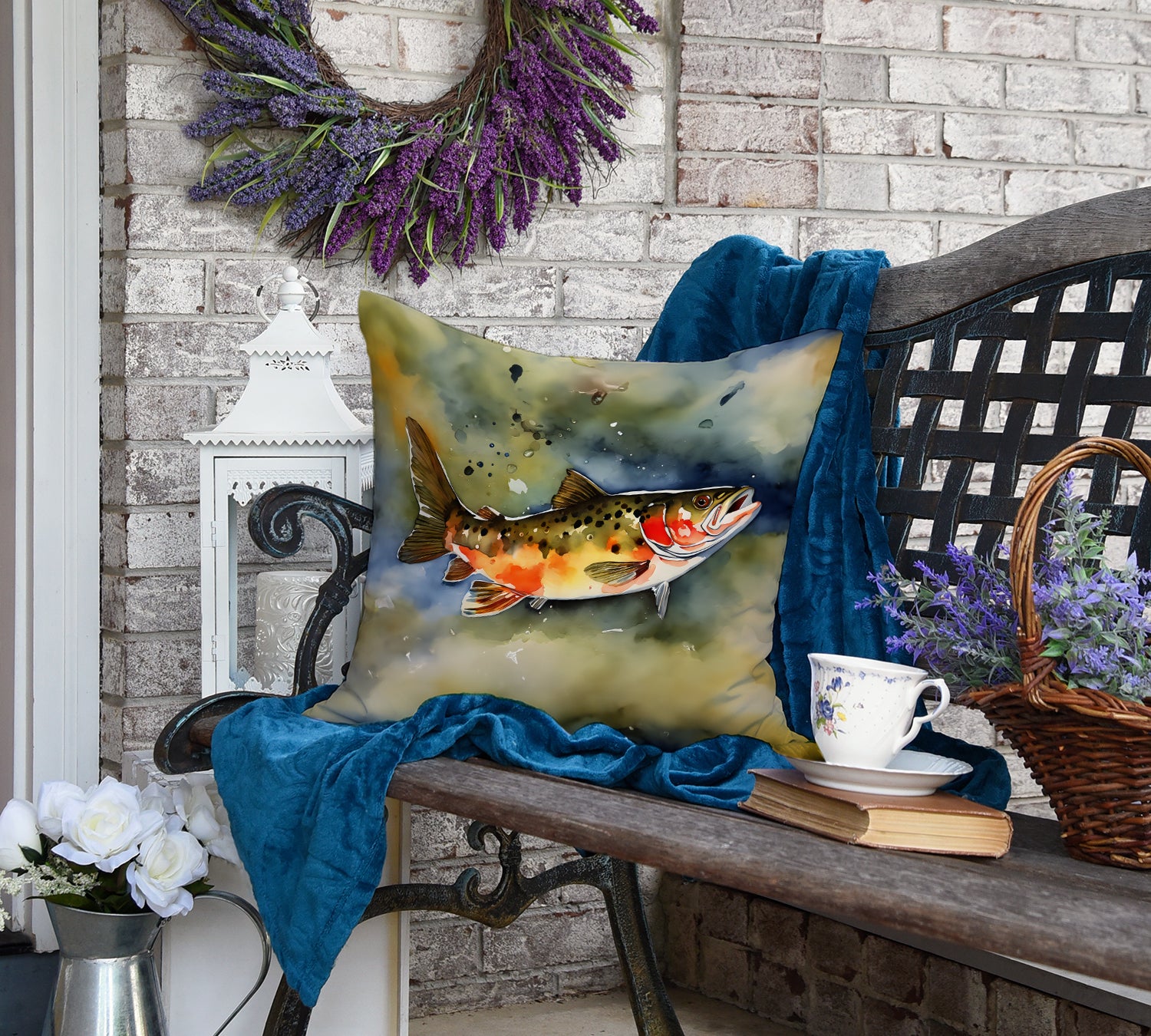 Throw Pillow featuring breed specific Brook Trout artwork. Revitalize your outdoor or indoor living space with Caroline's Treasures 18x18 Fabric Decorative Pillow. With a generously sized dimension of approximately 18 inches by 18 inches, this pillow makes a comfortable and aesthetic addition to any seating area. Made from a unique, water-resistant material developed by Caroline's Treasures, the pillow sham is 100% polyester fabric that's durable and ready to weather any condition. Its vibrant, full-color artwork will not fade over time as it is dyed with color-fast dyes. Whether you place it on your patio furniture, porch, veranda, or indoor couch, its soft canvas fabric ensures a cozy experience. The pillow is handcrafted in the United States, featuring a sham created from three pieces of fabric and a polyester insert for enduring shape and overstuffed comfort. Despite being robustly built to endure the outdoors, it is as soft and snug as your favorite indoor cushions. Please note, as all our pillows are handmade, sizes may vary slightly, adding to the charm of this unique decorative item.