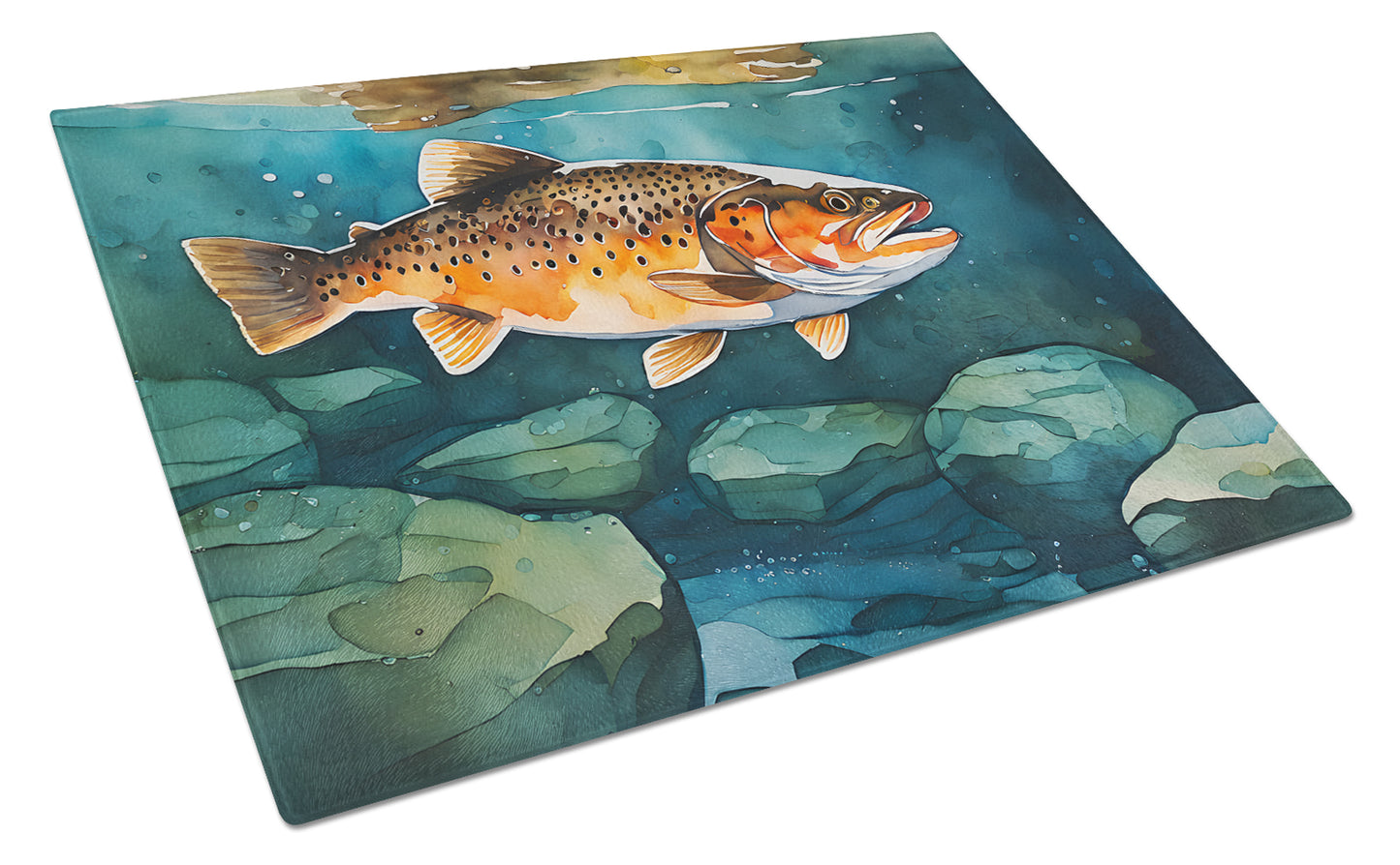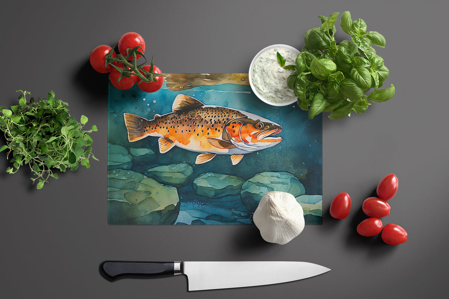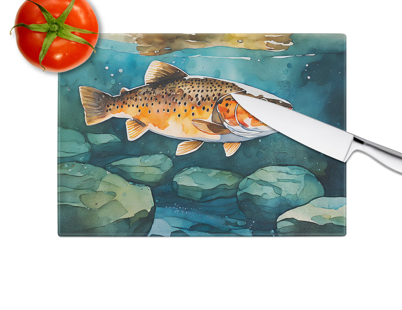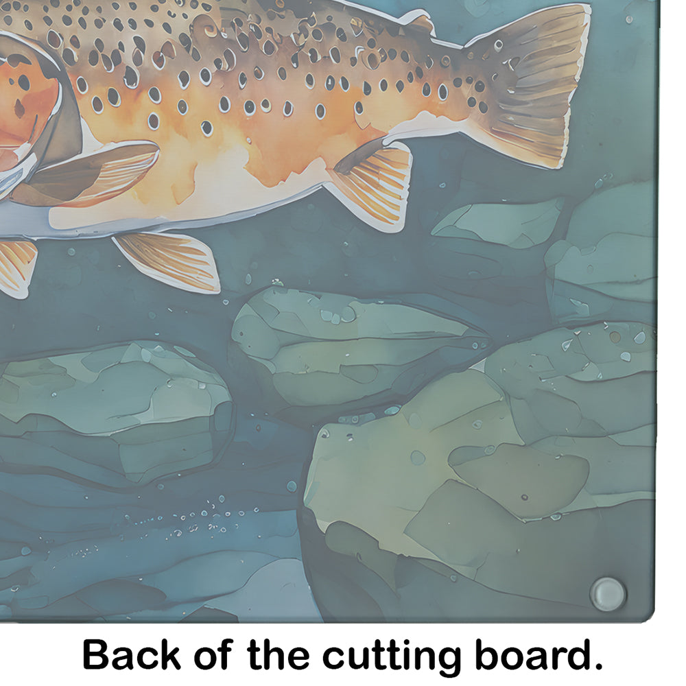 Glass Cutting Board featuring breed specific Brown Trout artwork. Introduce your kitchen to the vibrant, large Decorative Glass Cutting Board from Caroline's Treasures. Crafted from resilient tempered glass, this board is not only a utilitarian necessity but also a colorful art piece. With its generous dimensions of 15 inches in height and 12 inches in length, it offers ample space for all your cutting needs. Every piece showcases captivating artwork from distinguished artists, bringing an aesthetic edge to your kitchen. Beyond its attractive design, this cutting board ensures your countertop stays pristine and unscathed, owing to its heat-resistant properties. Engineered with user convenience in mind, it features non-skid feet for stability, and rounded corners for additional safety. Its robust construction renders it virtually unbreakable, guaranteeing longevity. The board comes with protective feet bumpers, maintaining its position during use. This product is recommended to be hand washed only. Proudly printed and assembled in the United States, this cutting board exemplifies superior craftsmanship. With Caroline's Treasures' Decorative Glass Cutting Board, you're investing in a blend of functionality and artistic flair.