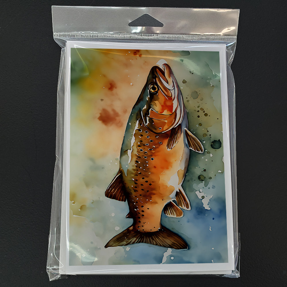Greeting Cards Pack of 8 featuring breed specific Brown Trout artwork. Celebrate special moments with Caroline's Treasures Printed Greeting Card Pack. This pack includes eight beautifully folded 5x7 cards, accompanied by eight matching white envelopes. With blank interiors, these cards provide ample space for your personalized messages and heartfelt holiday greetings. Each card features captivating full-color artwork, meticulously printed in our facility on high-quality 80 lb cover stock or 216 GSM. The super smooth finish of the white cards enhances the visual impact of the artwork, creating a truly stunning presentation. Designed by our talented in-house artists or licensed artists, the artwork on these cards showcases their creativity and attention to detail. From vibrant illustrations to captivating designs, each card tells its own unique story. Whether it's for birthdays, anniversaries, holidays, or any special occasion, Caroline's Treasures Greeting Card Pack is the perfect way to convey your heartfelt sentiments. Share joy, love, and warm wishes with these exquisite cards and make every moment unforgettable.