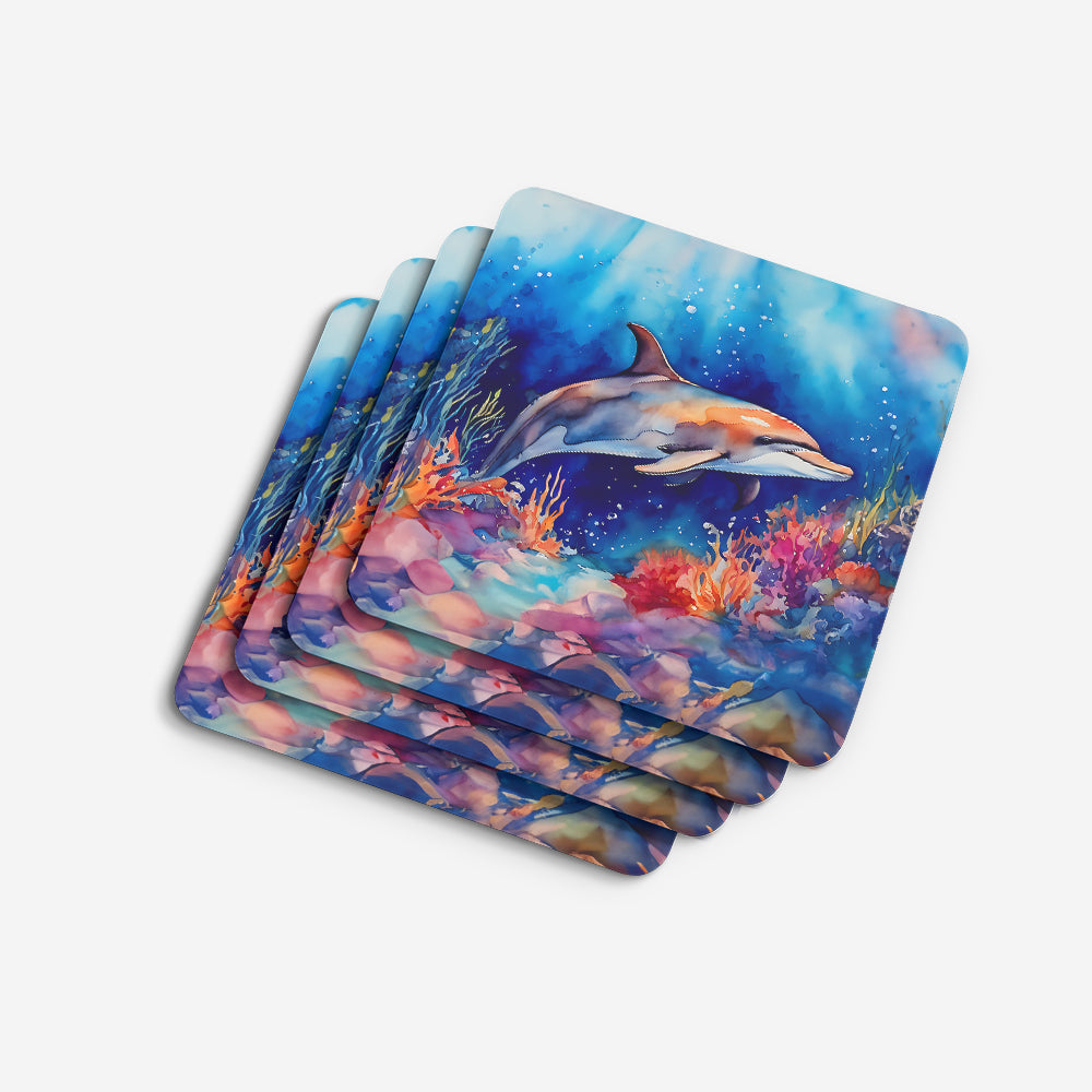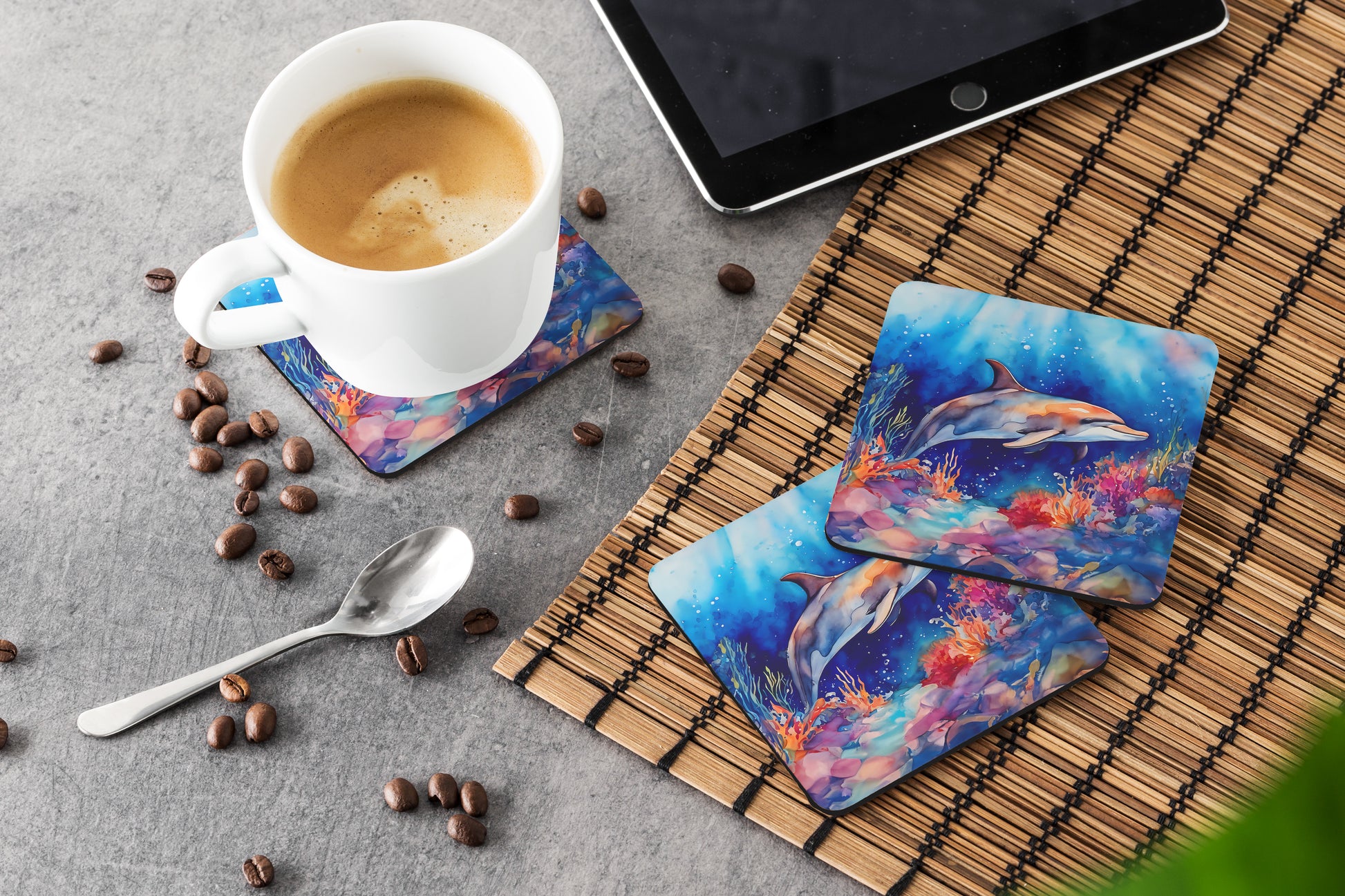 Foam Coasters featuring breed specific Dolphin artwork. Presenting our Set of 4 Foam Coasters, a stylish and practical addition to your table setting. Each square coaster, measuring 3 1/2 inches by 3 1/2 inches, is perfectly sized to accommodate various drinkware, from coffee mugs to tumblers. These coasters stand out with their full-color artwork, permanently dyed onto the material for a vibrant and fade-resistant finish. They're not just functional, they're a fashionable statement, adding a touch of flair to any gathering or event. Our foam coasters serve a dual purpose - they protect your table from water stains and are perfect for both hot and cold drinks. The material used is similar to that of our high-quality mouse pads, ensuring durability and heat resistance. These coasters are easy to maintain - simply wash them in the top of your dishwasher and lay flat to dry. The design won't come off, ensuring they retain their vivid colors for years. Pair them with one of our insulated coolers or huggers for a cohesive, thoughtful gift set. Enhance your beverage experience with our Set of 4 Foam Coasters.