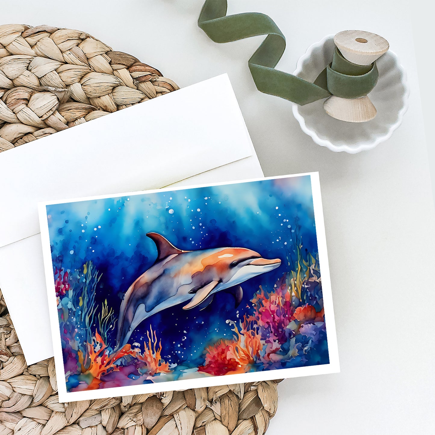 Greeting Cards Pack of 8 featuring breed specific Dolphin artwork. Celebrate special moments with Caroline's Treasures Printed Greeting Card Pack. This pack includes eight beautifully folded 5x7 cards, accompanied by eight matching white envelopes. With blank interiors, these cards provide ample space for your personalized messages and heartfelt holiday greetings. Each card features captivating full-color artwork, meticulously printed in our facility on high-quality 80 lb cover stock or 216 GSM. The super smooth finish of the white cards enhances the visual impact of the artwork, creating a truly stunning presentation. Designed by our talented in-house artists or licensed artists, the artwork on these cards showcases their creativity and attention to detail. From vibrant illustrations to captivating designs, each card tells its own unique story. Whether it's for birthdays, anniversaries, holidays, or any special occasion, Caroline's Treasures Greeting Card Pack is the perfect way to convey your heartfelt sentiments. Share joy, love, and warm wishes with these exquisite cards and make every moment unforgettable.