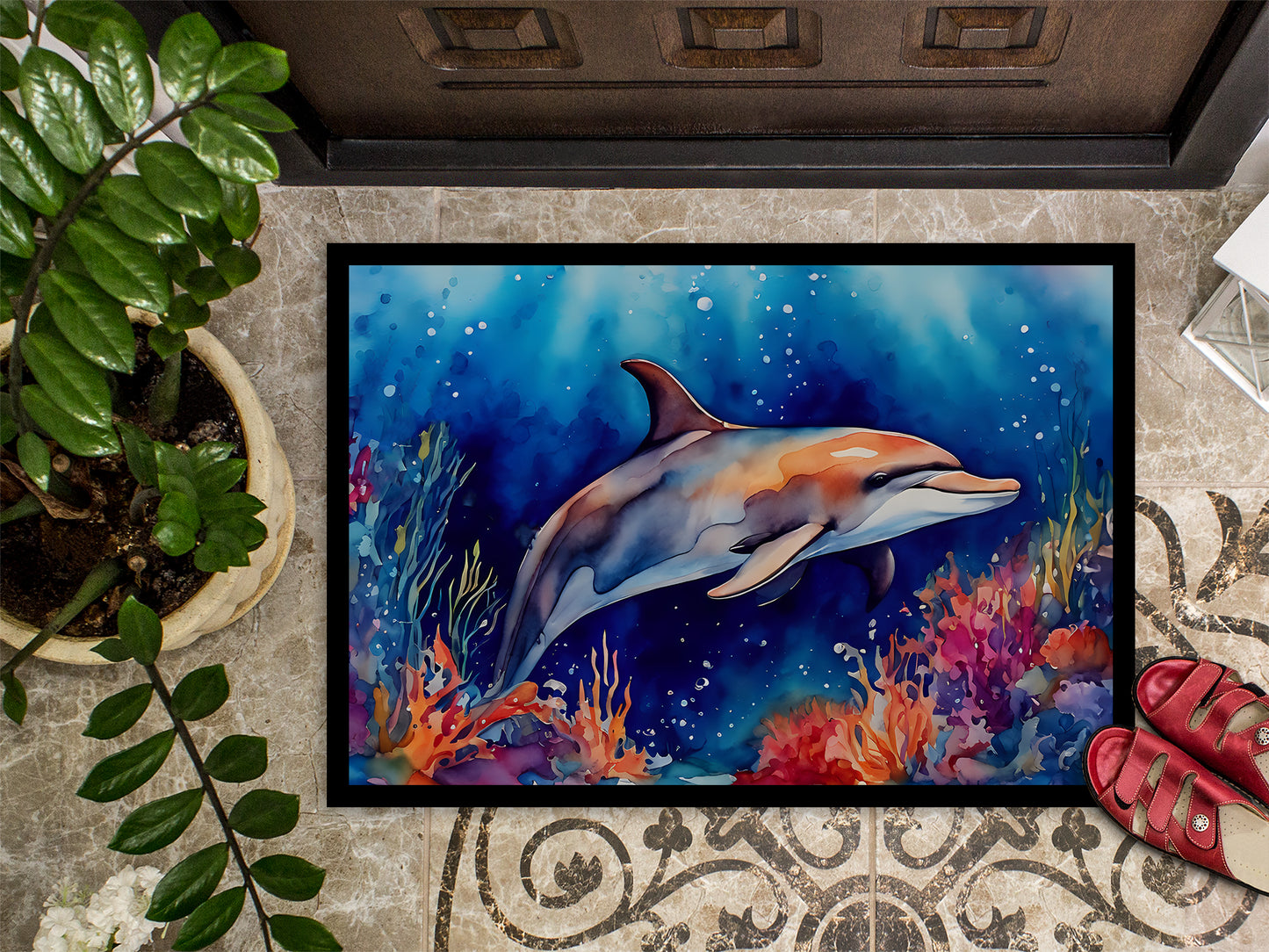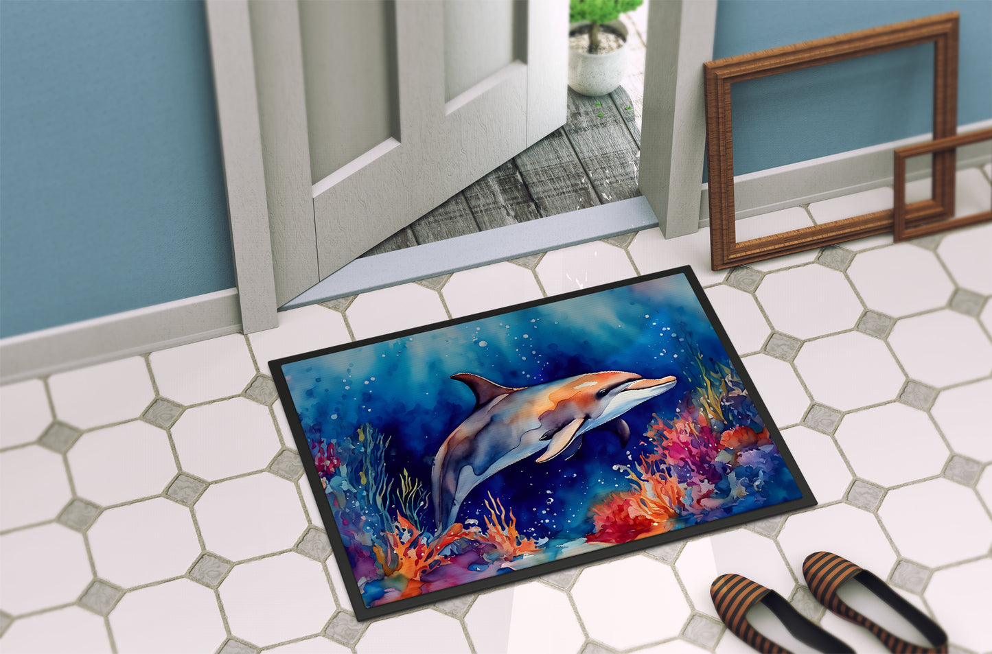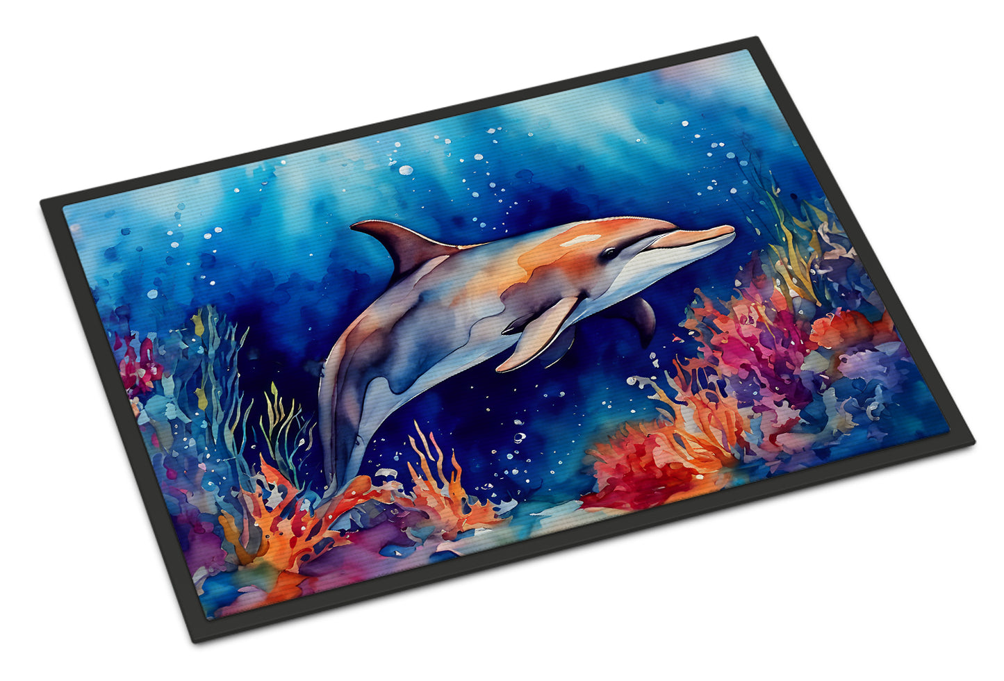 Doormat featuring breed specific Dolphin artwork. Welcome your guests in style with our Artwork Door Mat, designed to withstand almost any weather condition. This mat, measuring approximately 24 by 36 inches, is held together by durable black binding tape. Its top layer, composed of polyester felt, is dyed with the eye-catching image you see on the mat. A few layers below provide the mat with stability, while its rubber bottom is stamped to help prevent slipping and ensures safety. Our mat works wonderfully as both an indoor or outdoor door mat. For cleaning, simply hose it off with water or use a power washer - no need for any cleaner that produces suds. Avoid scrubbing with a brush, instead, opt for the vacuum on floor setting. Designed manufactured and printed in the USA, this mat is a perfect addition to your porch, outdoor kitchen, entryway, or any indoor space. Its unique design makes it a charming decorative rug that greets your guests and adds a stylish touch to your home decor.