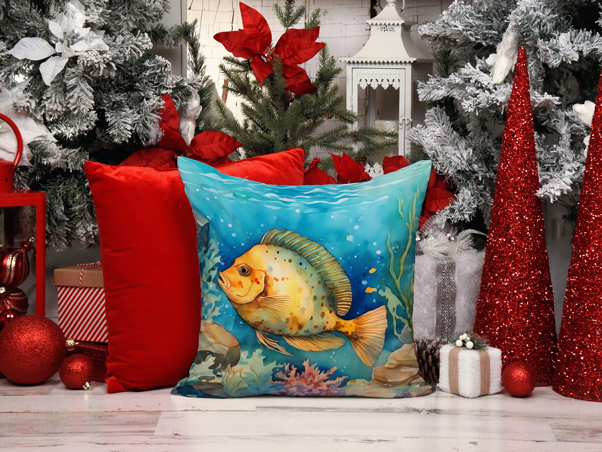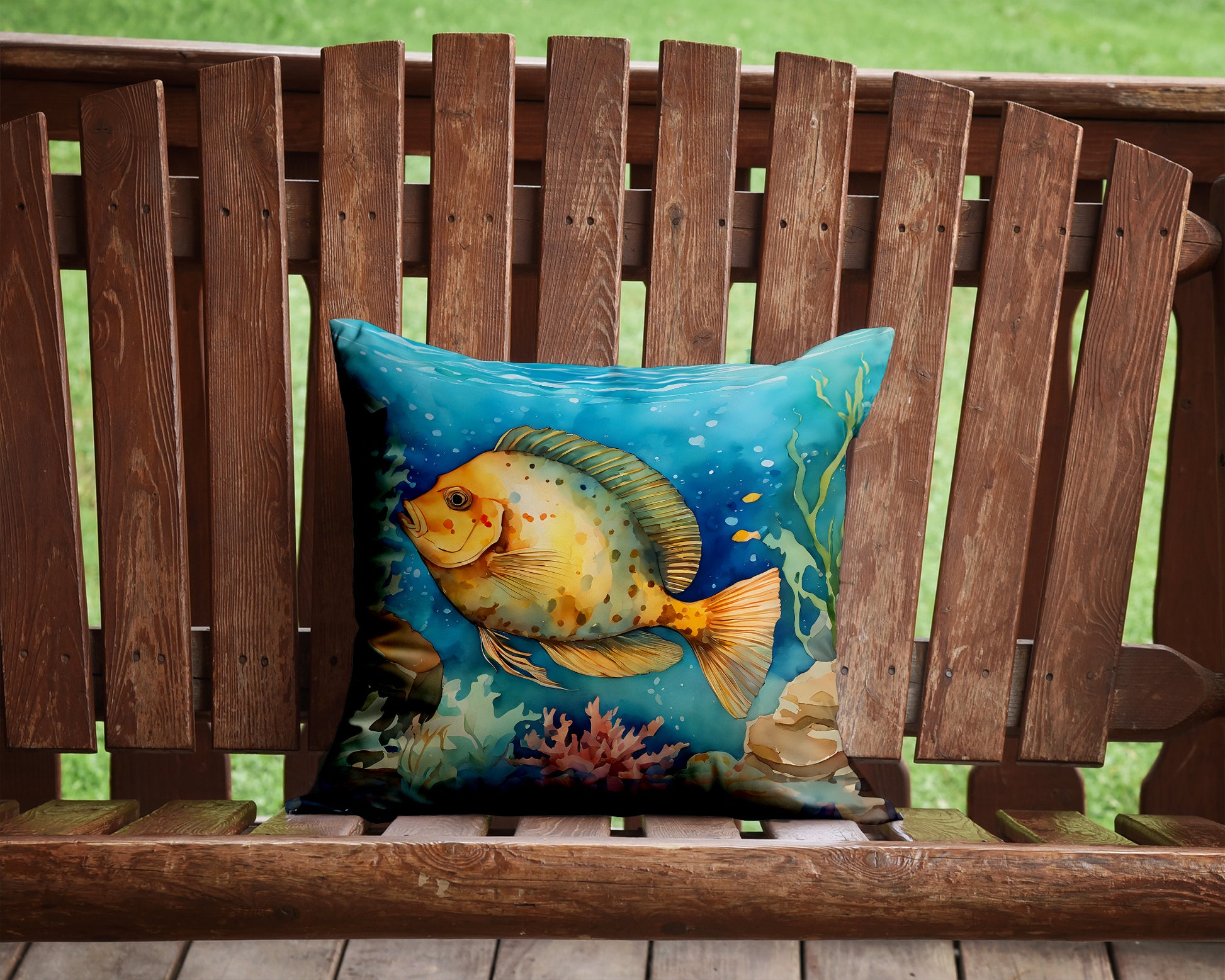 Throw Pillow featuring breed specific Flounder artwork. Add a touch of vibrancy and comfort to your outdoor seating with Caroline's Treasures Fabric Decorative Pillow. Measuring approximately 14 inches by 14 inches, this outdoor pillow is crafted to elevate the appeal of your patio furniture, infusing it with vivid color and artistic flair. The pillow includes a 100% Polyester Fabric sham filled with a quality pillow form to provide superior comfort. Innovatively made from our brand new material, specifically woven for its water resistance, this pillow is designed for durability. The soft canvas fabric offers versatility in use, fit for your indoor couch or your outdoor patio, porch, or veranda. The fabric is dyed with colorfast dyes built for resilience against weather conditions, ensuring the pillow retains its beauty over time. Constructed by sewing three fabric pieces to create a sham, the polyester insert is then nestled inside to form the pillow, resulting in an overstuffed pillow that maintains its shape. Both the sham and the pillow insert are proudly made in the United States. As the pillows are handcrafted, there may be minor variations in size, further enhancing their unique charm. Experience comfort in style with Caroline's Treasures Fabric Decorative Pillow.