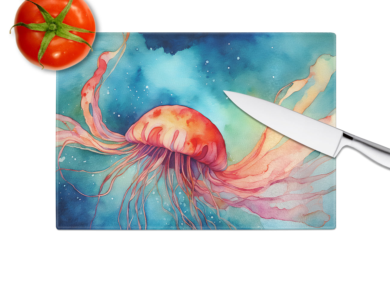 Glass Cutting Board featuring breed specific Jellyfish artwork. Introduce your kitchen to the vibrant, large Decorative Glass Cutting Board from Caroline's Treasures. Crafted from resilient tempered glass, this board is not only a utilitarian necessity but also a colorful art piece. With its generous dimensions of 15 inches in height and 12 inches in length, it offers ample space for all your cutting needs. Every piece showcases captivating artwork from distinguished artists, bringing an aesthetic edge to your kitchen. Beyond its attractive design, this cutting board ensures your countertop stays pristine and unscathed, owing to its heat-resistant properties. Engineered with user convenience in mind, it features non-skid feet for stability, and rounded corners for additional safety. Its robust construction renders it virtually unbreakable, guaranteeing longevity. The board comes with protective feet bumpers, maintaining its position during use. This product is recommended to be hand washed only. Proudly printed and assembled in the United States, this cutting board exemplifies superior craftsmanship. With Caroline's Treasures' Decorative Glass Cutting Board, you're investing in a blend of functionality and artistic flair.