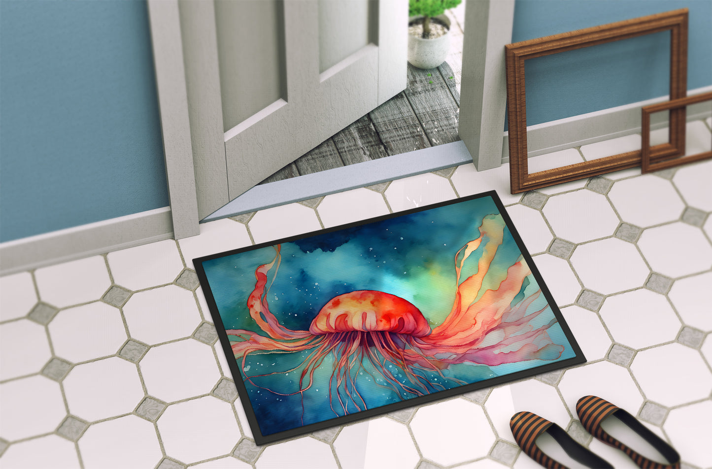 Doormat featuring breed specific Jellyfish artwork. Welcome your guests in style with our Artwork Door Mat, designed to withstand almost any weather condition. This mat, measuring approximately 18 by 27 inches, is held together by durable black binding tape. Its top layer, composed of polyester felt, is dyed with the eye-catching image you see on the mat. A few layers below provide the mat with stability, while its rubber bottom is stamped to help prevent slipping and ensures safety. Our mat works wonderfully as both an indoor or outdoor door mat. For cleaning, simply hose it off with water or use a power washer - no need for any cleaner that produces suds. Avoid scrubbing with a brush, instead, opt for the vacuum on floor setting. Designed manufactured and printed in the USA, this mat is a perfect addition to your porch, outdoor kitchen, entryway, or any indoor space. Its unique design makes it a charming decorative rug that greets your guests and adds a stylish touch to your home decor.