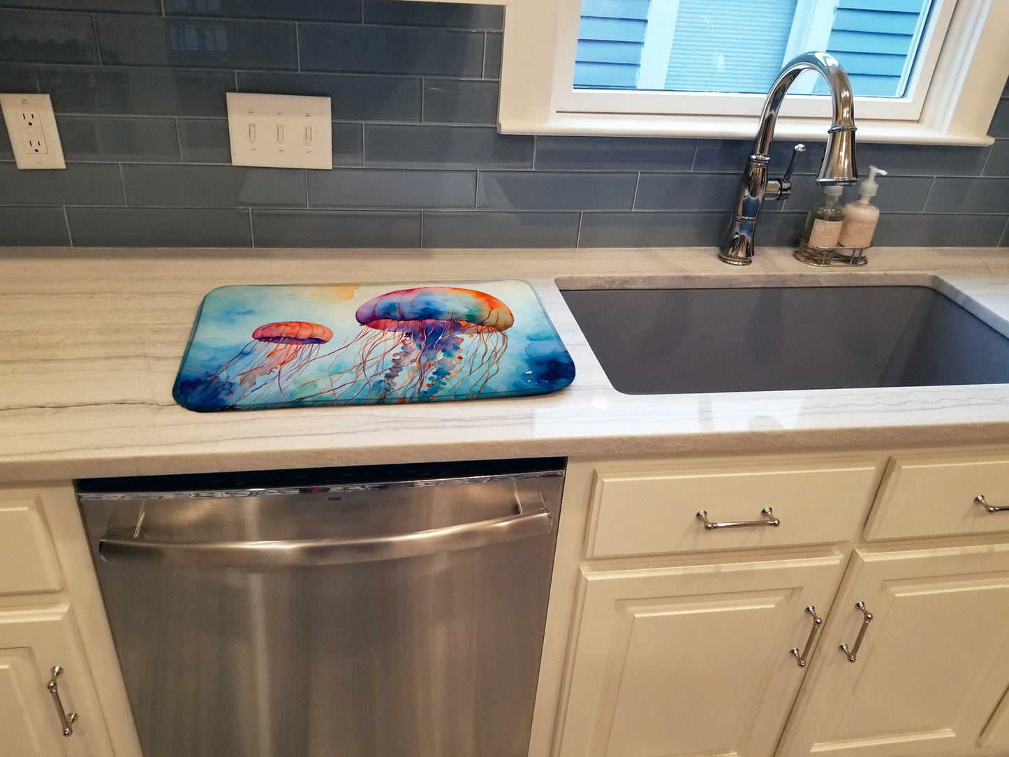 Dish Drying Mat featuring breed specific Jellyfish artwork. Say goodbye to messy countertops and soggy dish towels with our innovative dish drying mat. Our high-quality dish drying pad is designed to keep your countertops dry while offering a stylish and efficient solution. Whether you're air drying dishes, glasses, stemware, silverware, pots, pans, bottles, or even fruits and vegetables, our dish mat is the perfect choice. The 14 inches x 22 inches size fits most counters and dish drying racks, and the non-slip design ensures stability. Made with water-absorbent polyester and a polyurethane foam insert, our dish drying mat is not only functional but also durable. It's machine washable and printed in the USA for long-lasting use. The beautiful artwork adds flair to your kitchen decor, making it a perfect housewarming gift or present for any occasion. Upgrade your kitchen experience with our absorbent and versatile dish drying mat.