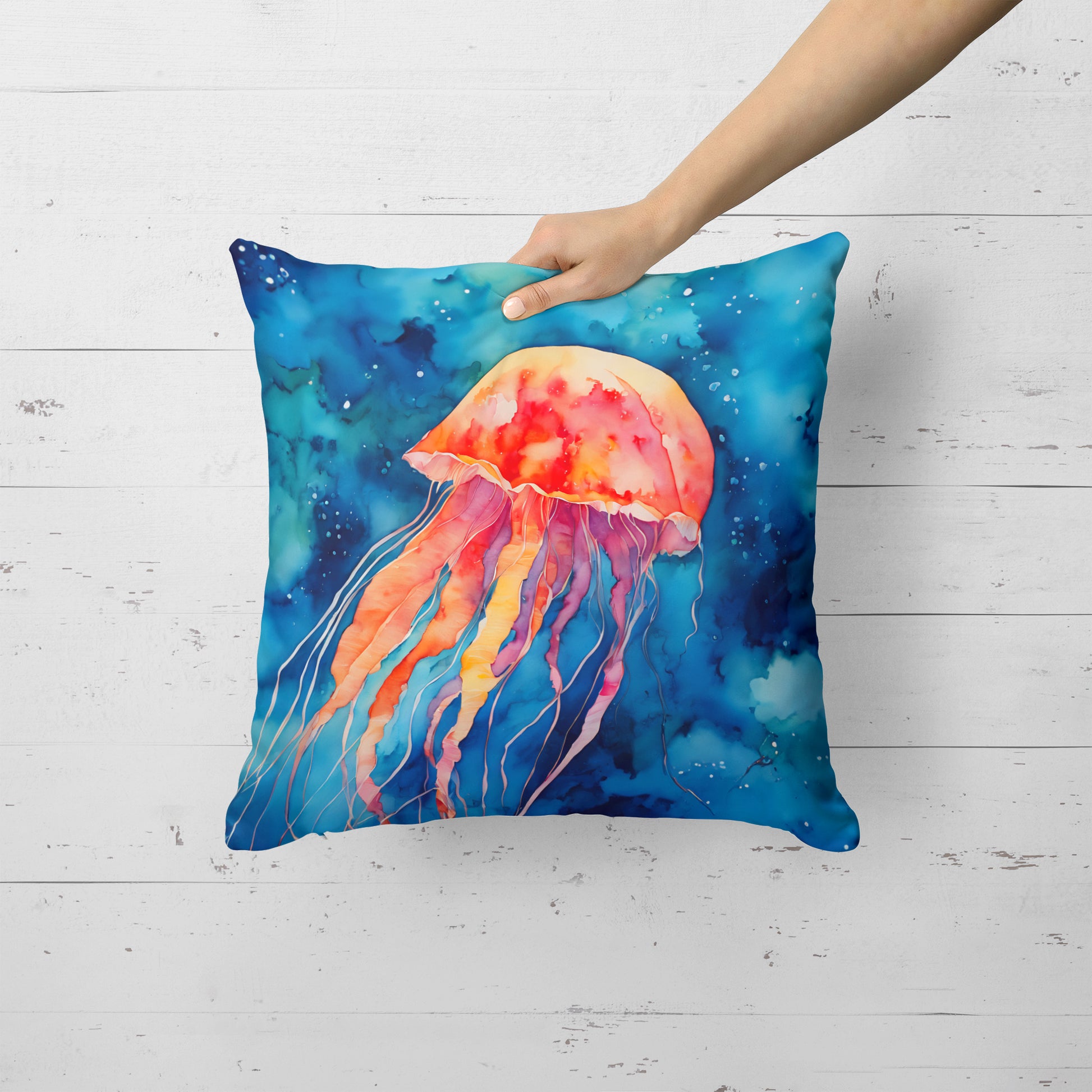 Throw Pillow featuring breed specific Jellyfish artwork. Revitalize your outdoor or indoor living space with Caroline's Treasures 18x18 Fabric Decorative Pillow. With a generously sized dimension of approximately 18 inches by 18 inches, this pillow makes a comfortable and aesthetic addition to any seating area. Made from a unique, water-resistant material developed by Caroline's Treasures, the pillow sham is 100% polyester fabric that's durable and ready to weather any condition. Its vibrant, full-color artwork will not fade over time as it is dyed with color-fast dyes. Whether you place it on your patio furniture, porch, veranda, or indoor couch, its soft canvas fabric ensures a cozy experience. The pillow is handcrafted in the United States, featuring a sham created from three pieces of fabric and a polyester insert for enduring shape and overstuffed comfort. Despite being robustly built to endure the outdoors, it is as soft and snug as your favorite indoor cushions. Please note, as all our pillows are handmade, sizes may vary slightly, adding to the charm of this unique decorative item.