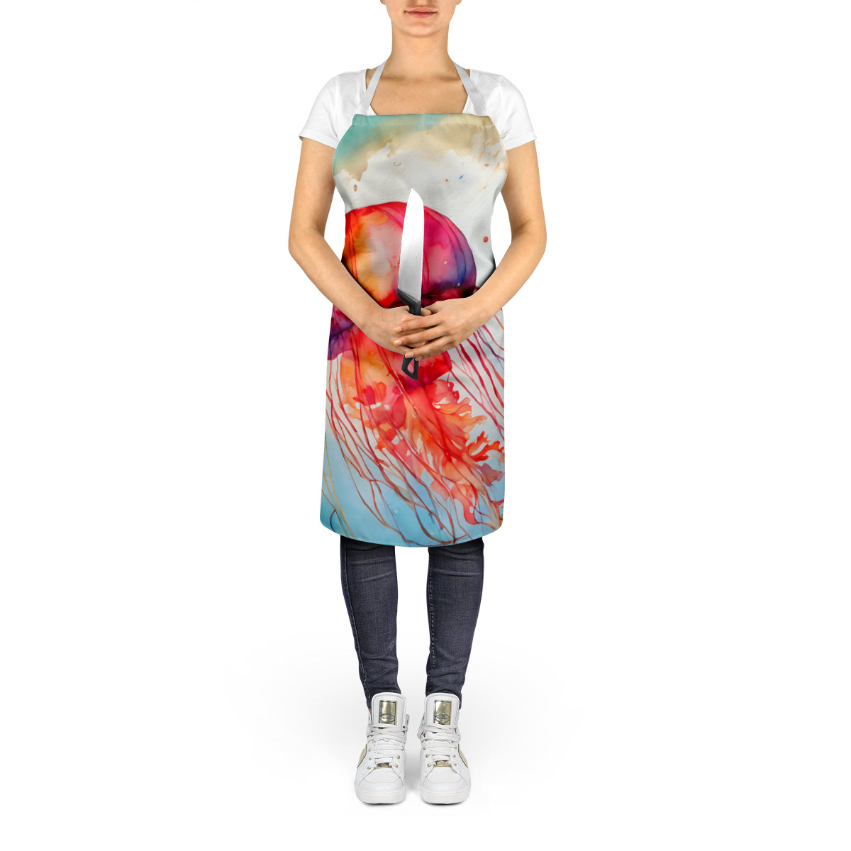 Apron featuring breed specific Jellyfish artwork. Elevate your cooking, baking, and grilling experiences with our versatile Kitchen or BBQ Apron. This Bib Style apron isn't just limited to culinary activities - it also serves as an excellent baking apron, artist apron, server apron, gardening apron, or even a dog grooming apron. The apron showcases vibrant full-color artwork contributed by one of our talented artists, bringing a dash of style to your daily tasks. With dimensions of approximately 27"W x 30"H, it provides ample coverage to protect your clothing from spills and splashes. Our apron is meticulously crafted from 100% Ultra Spun Polyester, known for its durability and lightweight nature. The apron comes with white tie straps, ensuring a comfortable and adjustable fit for all. It's a perfect choice for kitchen apron enthusiasts, whether you are a woman or a man. Designed for easy maintenance, this apron is fully machine washable. The quick-drying polyester material actively reduces staining, keeping your apron looking fresh and new for longer. Our beautifully designed apron isn't just a functional kitchen accessory - it's a fashion statement in the culinary world!