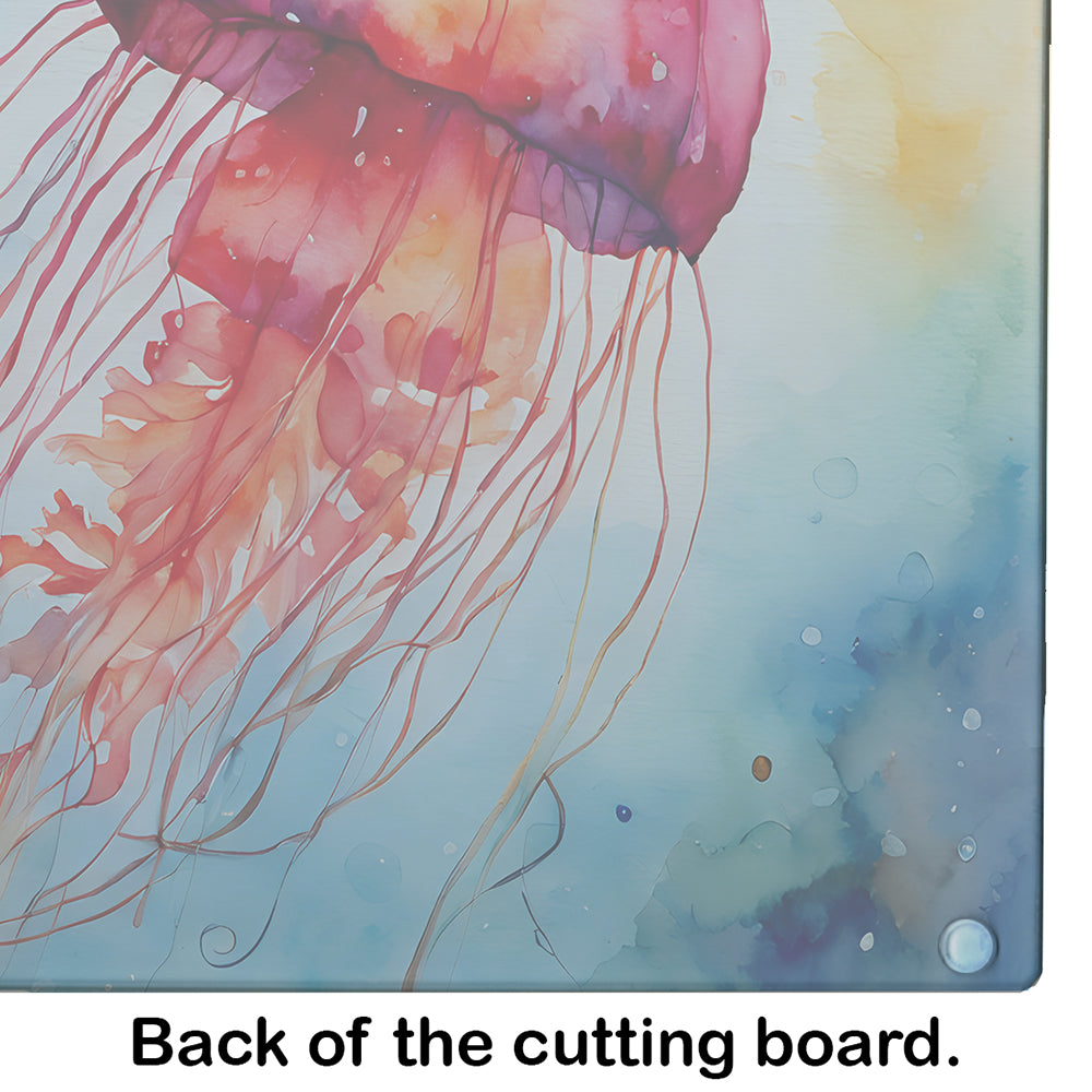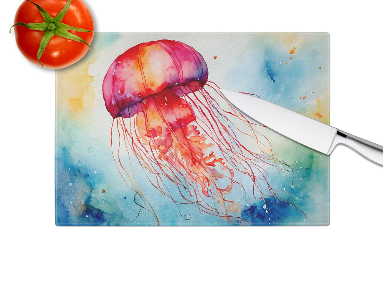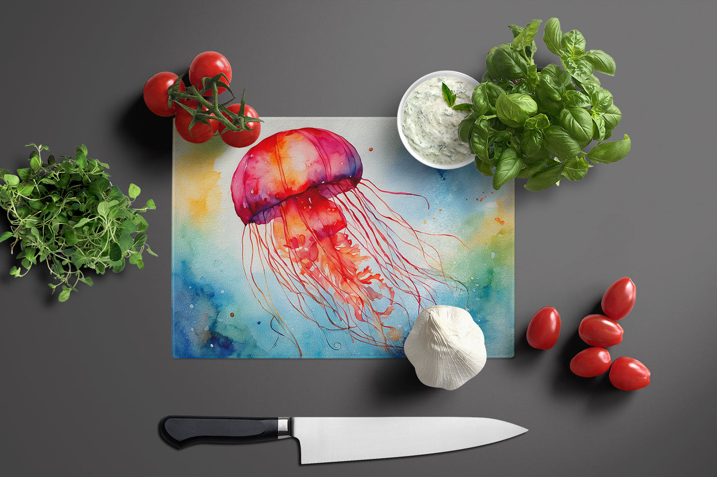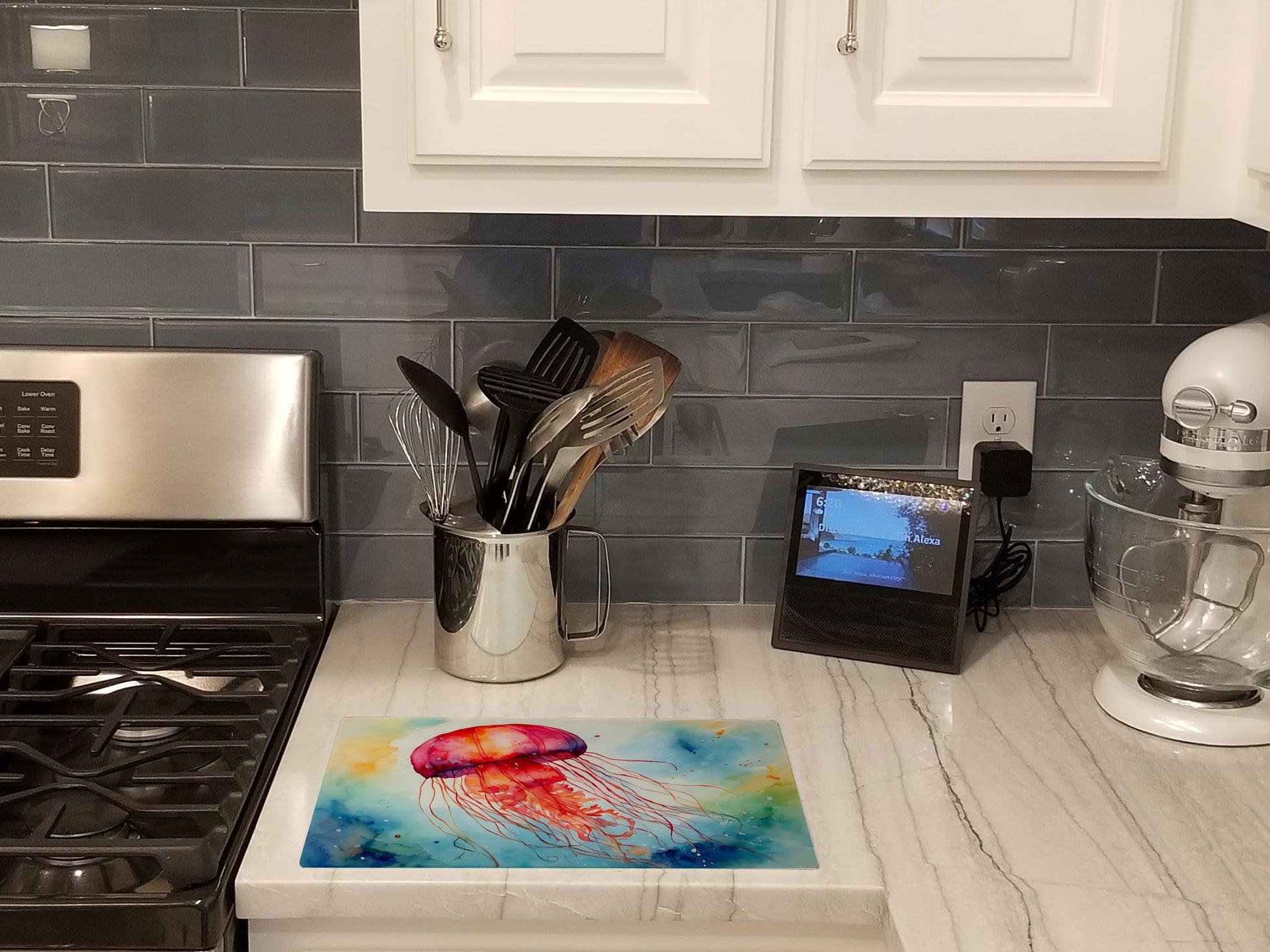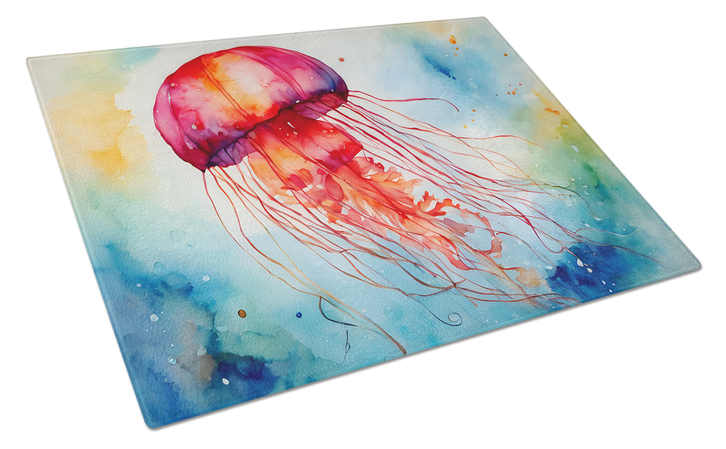 Glass Cutting Board featuring breed specific Jellyfish artwork. Introduce your kitchen to the vibrant, large Decorative Glass Cutting Board from Caroline's Treasures. Crafted from resilient tempered glass, this board is not only a utilitarian necessity but also a colorful art piece. With its generous dimensions of 15 inches in height and 12 inches in length, it offers ample space for all your cutting needs. Every piece showcases captivating artwork from distinguished artists, bringing an aesthetic edge to your kitchen. Beyond its attractive design, this cutting board ensures your countertop stays pristine and unscathed, owing to its heat-resistant properties. Engineered with user convenience in mind, it features non-skid feet for stability, and rounded corners for additional safety. Its robust construction renders it virtually unbreakable, guaranteeing longevity. The board comes with protective feet bumpers, maintaining its position during use. This product is recommended to be hand washed only. Proudly printed and assembled in the United States, this cutting board exemplifies superior craftsmanship. With Caroline's Treasures' Decorative Glass Cutting Board, you're investing in a blend of functionality and artistic flair.