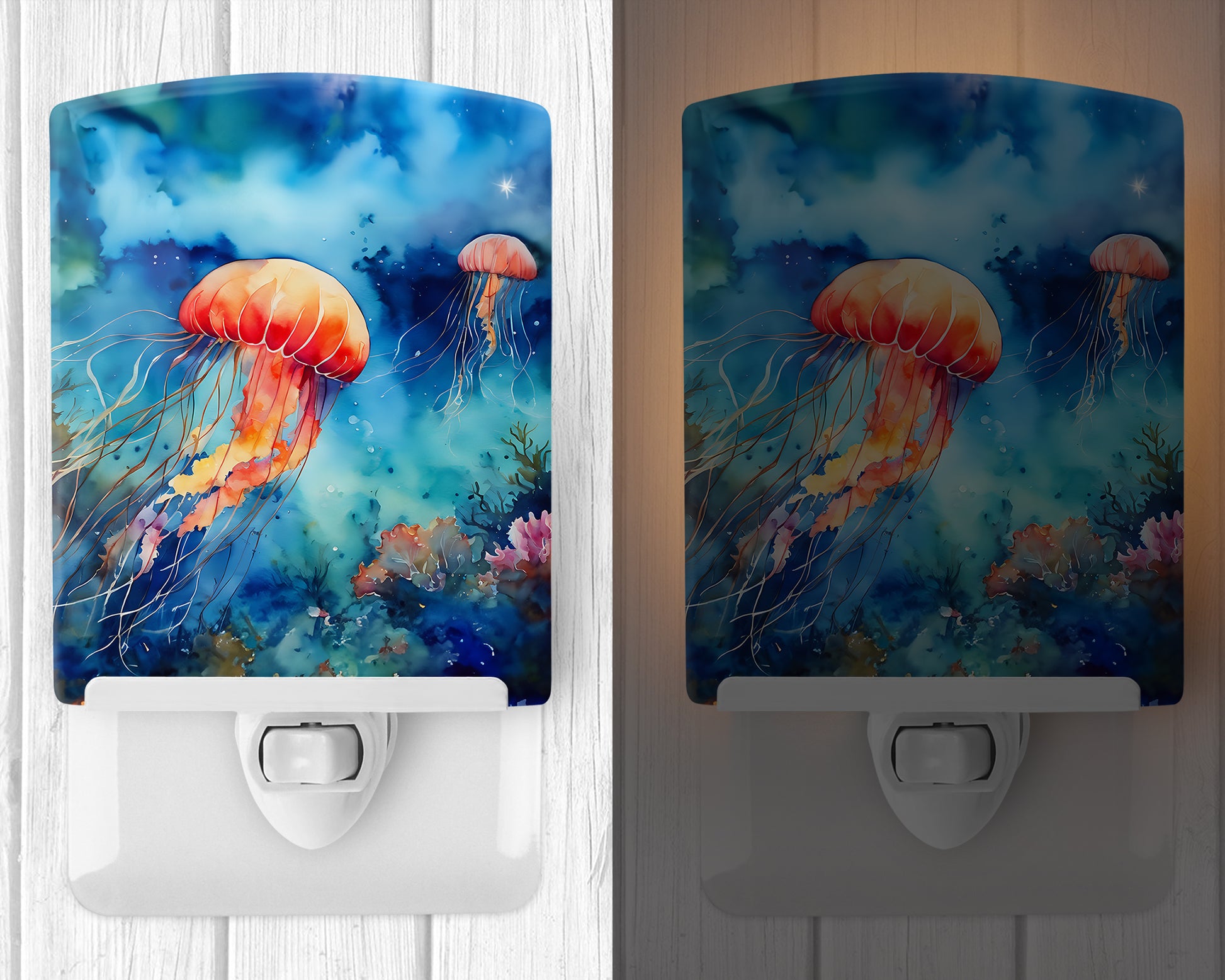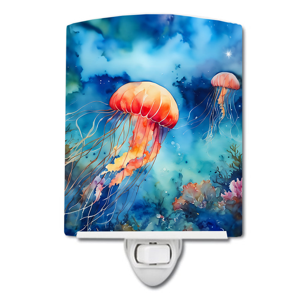 Ceramic Night Light featuring breed specific Jellyfish artwork. Introduce a splash of artistic flair and subtle illumination to your space with the Decorative Ceramic Night Light from Caroline's Treasures. Perfect for any room, this night light seamlessly blends functionality with an aesthetic appeal, offering a stylish solution to brighten up dark corners of your home or office. Boasting a six-inch high by four-inch wide ceramic tile at the front, it showcases vivid, full-color artwork from distinguished artists, transforming a simple utility into a vibrant art piece. The artwork is securely encased in a robust metal holder, ensuring durability and longevity. Two screws are provided to firmly affix the tile into the holder. The holder extends three inches deep, housing an included bulb that emits a soft, welcoming glow. This product meets all safety standards, as evidenced by its UL approval. Proudly made in the United States from imported components, this Decorative Ceramic Night Light is not just a functional device; it's a statement piece that enhances the ambiance of your surroundings.