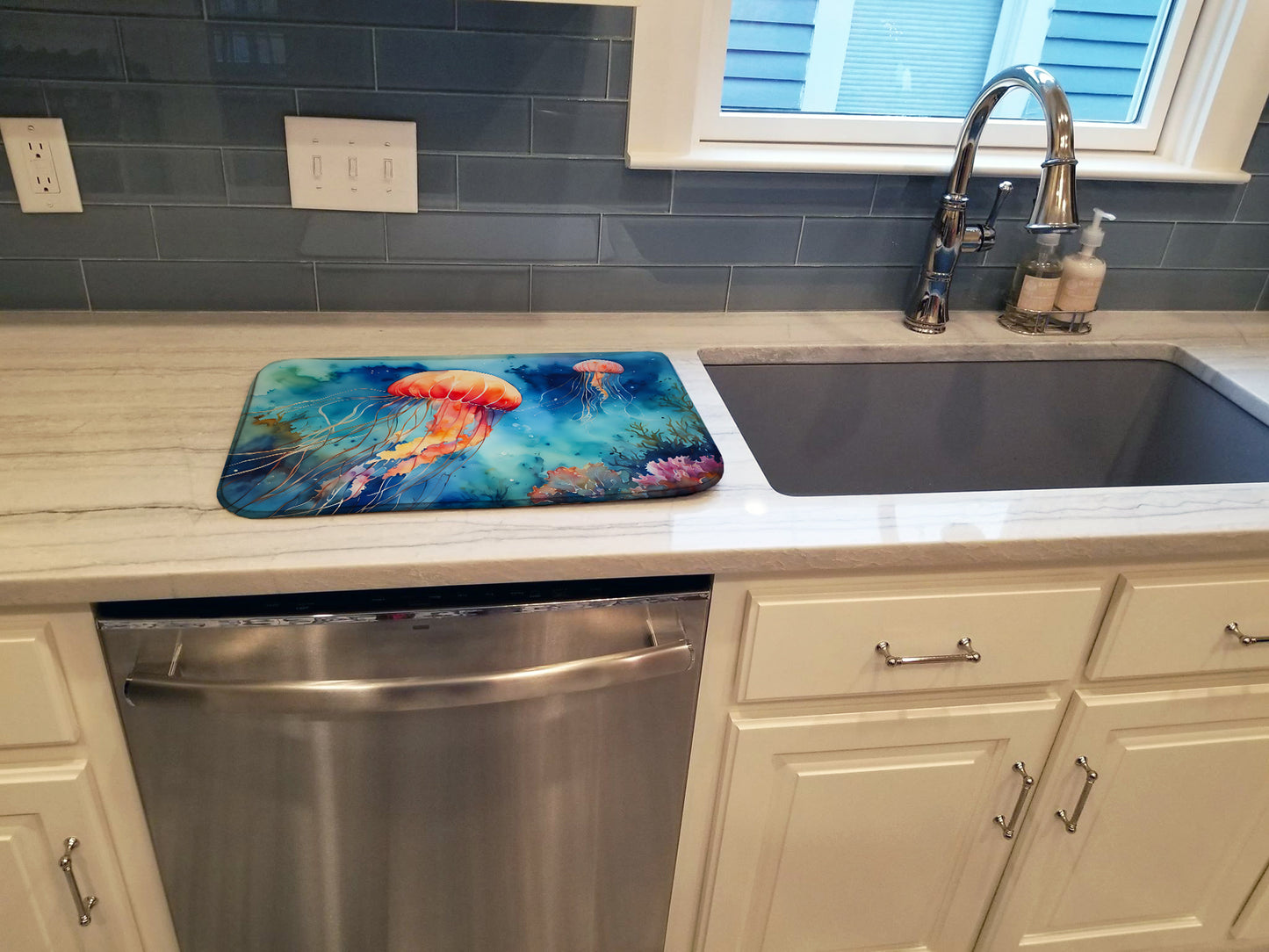 Dish Drying Mat featuring breed specific Jellyfish artwork. Say goodbye to messy countertops and soggy dish towels with our innovative dish drying mat. Our high-quality dish drying pad is designed to keep your countertops dry while offering a stylish and efficient solution. Whether you're air drying dishes, glasses, stemware, silverware, pots, pans, bottles, or even fruits and vegetables, our dish mat is the perfect choice. The 14 inches x 22 inches size fits most counters and dish drying racks, and the non-slip design ensures stability. Made with water-absorbent polyester and a polyurethane foam insert, our dish drying mat is not only functional but also durable. It's machine washable and printed in the USA for long-lasting use. The beautiful artwork adds flair to your kitchen decor, making it a perfect housewarming gift or present for any occasion. Upgrade your kitchen experience with our absorbent and versatile dish drying mat.