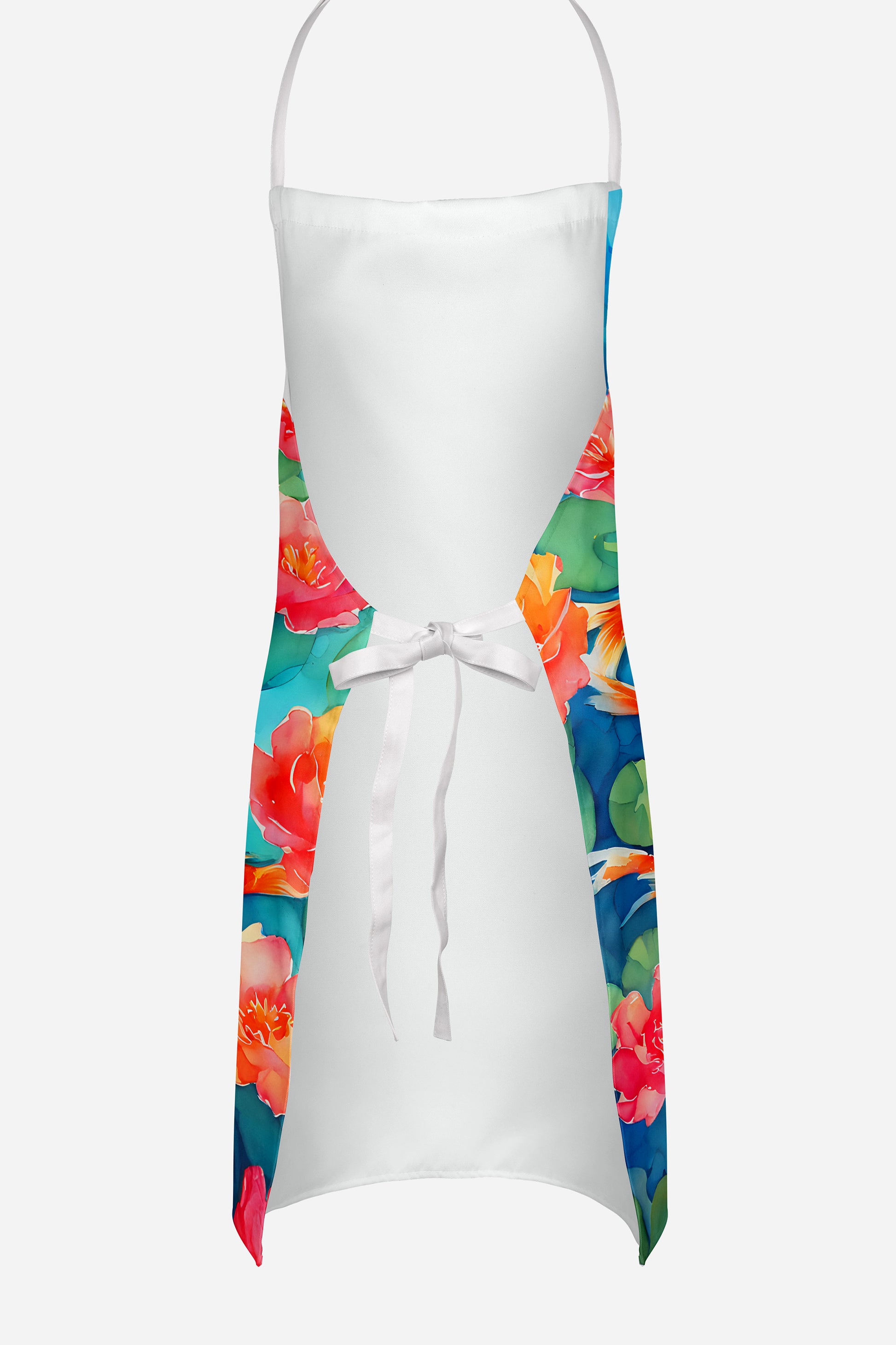 Apron featuring breed specific Koi Fish artwork. Elevate your cooking, baking, and grilling experiences with our versatile Kitchen or BBQ Apron. This Bib Style apron isn't just limited to culinary activities - it also serves as an excellent baking apron, artist apron, server apron, gardening apron, or even a dog grooming apron. The apron showcases vibrant full-color artwork contributed by one of our talented artists, bringing a dash of style to your daily tasks. With dimensions of approximately 27"W x 30"H, it provides ample coverage to protect your clothing from spills and splashes. Our apron is meticulously crafted from 100% Ultra Spun Polyester, known for its durability and lightweight nature. The apron comes with white tie straps, ensuring a comfortable and adjustable fit for all. It's a perfect choice for kitchen apron enthusiasts, whether you are a woman or a man. Designed for easy maintenance, this apron is fully machine washable. The quick-drying polyester material actively reduces staining, keeping your apron looking fresh and new for longer. Our beautifully designed apron isn't just a functional kitchen accessory - it's a fashion statement in the culinary world!