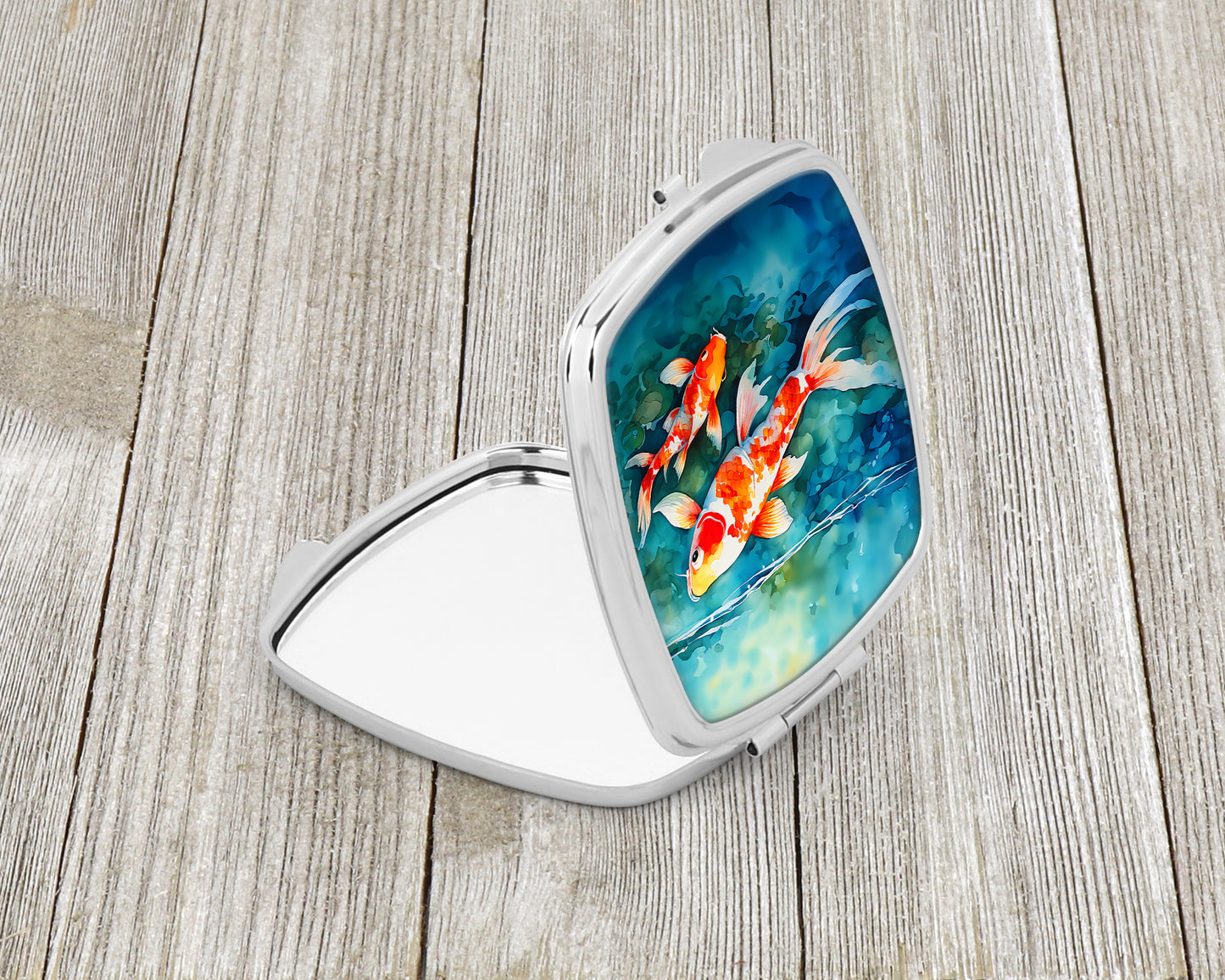 Compact Mirror featuring breed specific Koi Fish artwork. Introducing our Square Compact Mirror, a blend of elegance, functionality, and compactness, perfect for on-the-go touch-ups. This Silvertone metal mirror, with dimensions of 2.75 inches x 3 inches x .3 inches, fits effortlessly into your purse, handbag, or pocket, ensuring that you can check your appearance anytime, anywhere. Our compact mirror stands out with its eye-catching artwork on the front, adding a dash of style to this practical accessory. It is more than just a mirror; it's a statement piece that reflects your personality and aesthetic. When opened, this compact reveals two mirrors inside, doubling your perspective for precise touch-ups. The Silvertone metal construction ensures durability while maintaining a lightweight feel, making it an ideal everyday carry item. Whether you're rushing to a meeting, prepping for a dinner date, or just need a quick check on your look, our Square Compact Mirror is your reliable companion. Experience the perfect blend of style and practicality with this must-have accessory.
