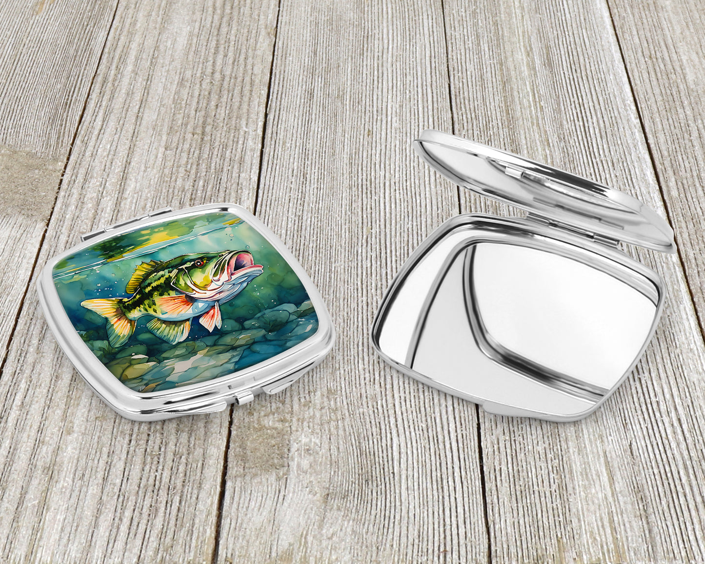 Compact Mirror featuring breed specific Largemouth Bass artwork. Introducing our Square Compact Mirror, a blend of elegance, functionality, and compactness, perfect for on-the-go touch-ups. This Silvertone metal mirror, with dimensions of 2.75 inches x 3 inches x .3 inches, fits effortlessly into your purse, handbag, or pocket, ensuring that you can check your appearance anytime, anywhere. Our compact mirror stands out with its eye-catching artwork on the front, adding a dash of style to this practical accessory. It is more than just a mirror; it's a statement piece that reflects your personality and aesthetic. When opened, this compact reveals two mirrors inside, doubling your perspective for precise touch-ups. The Silvertone metal construction ensures durability while maintaining a lightweight feel, making it an ideal everyday carry item. Whether you're rushing to a meeting, prepping for a dinner date, or just need a quick check on your look, our Square Compact Mirror is your reliable companion. Experience the perfect blend of style and practicality with this must-have accessory.