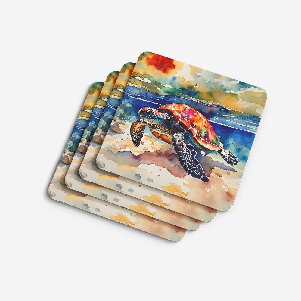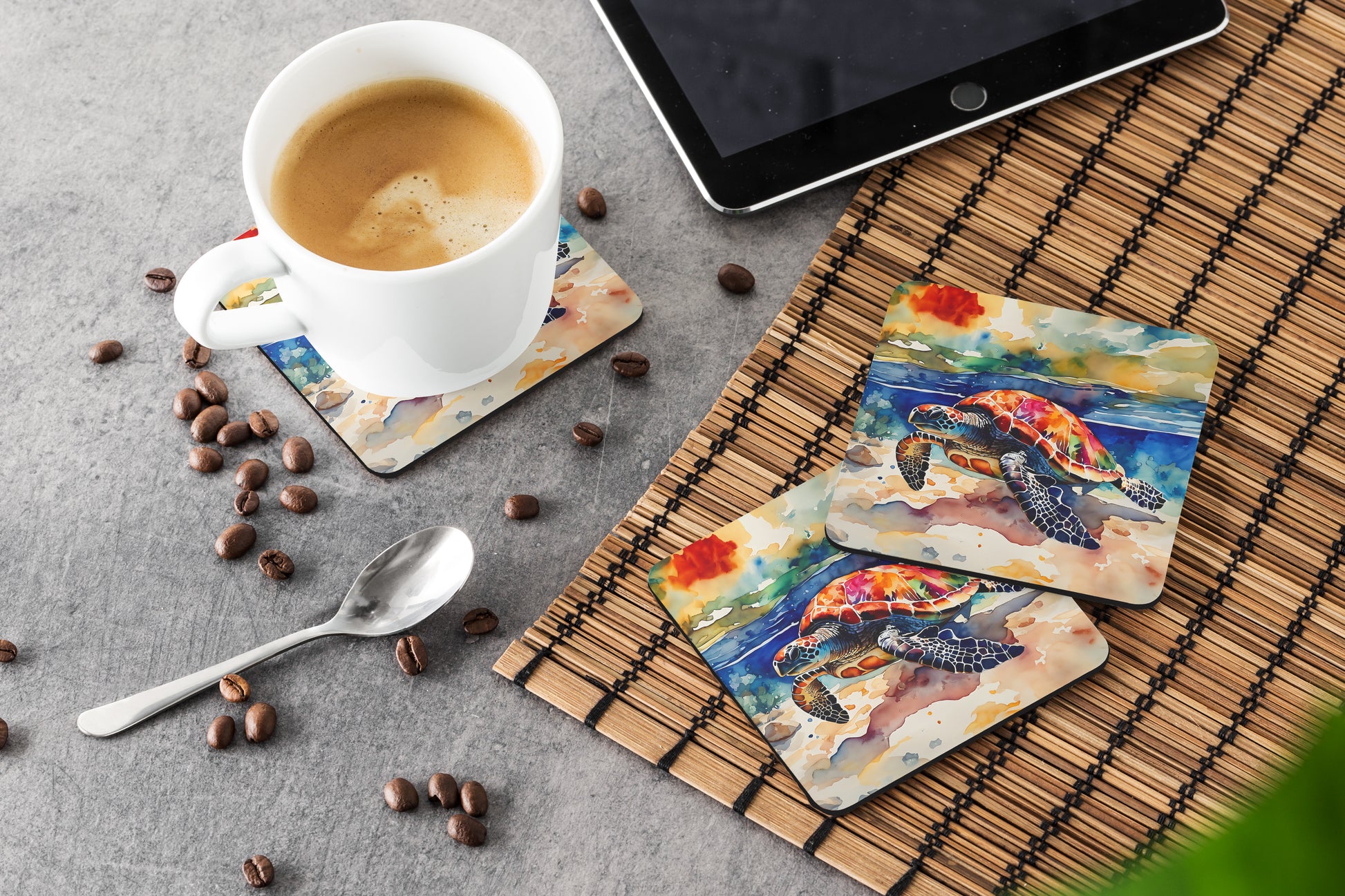 Foam Coasters featuring breed specific Loggerhead Sea Turtle artwork. Presenting our Set of 4 Foam Coasters, a stylish and practical addition to your table setting. Each square coaster, measuring 3 1/2 inches by 3 1/2 inches, is perfectly sized to accommodate various drinkware, from coffee mugs to tumblers. These coasters stand out with their full-color artwork, permanently dyed onto the material for a vibrant and fade-resistant finish. They're not just functional, they're a fashionable statement, adding a touch of flair to any gathering or event. Our foam coasters serve a dual purpose - they protect your table from water stains and are perfect for both hot and cold drinks. The material used is similar to that of our high-quality mouse pads, ensuring durability and heat resistance. These coasters are easy to maintain - simply wash them in the top of your dishwasher and lay flat to dry. The design won't come off, ensuring they retain their vivid colors for years. Pair them with one of our insulated coolers or huggers for a cohesive, thoughtful gift set. Enhance your beverage experience with our Set of 4 Foam Coasters.