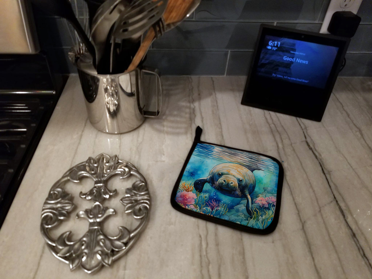 Pair of Pot Holders featuring breed specific Manatee artwork. A Pair of Pot Holders to match your kitchen decor. Made in the USA these are thick and functional. Full color artwork decorates the front polyester fabric of the hot pad and accented by a black trim. Use these at as a trivet for your Thanksgiving or Christmas tablescape. Filled with insulated fabric and quilted for durability. These colorful pot holders will make a great gift for your favorite home cook or executive chef. Each pot holder measures approximately 7 1/2 inches by 7 1/2 inches. A hanging tab is included.