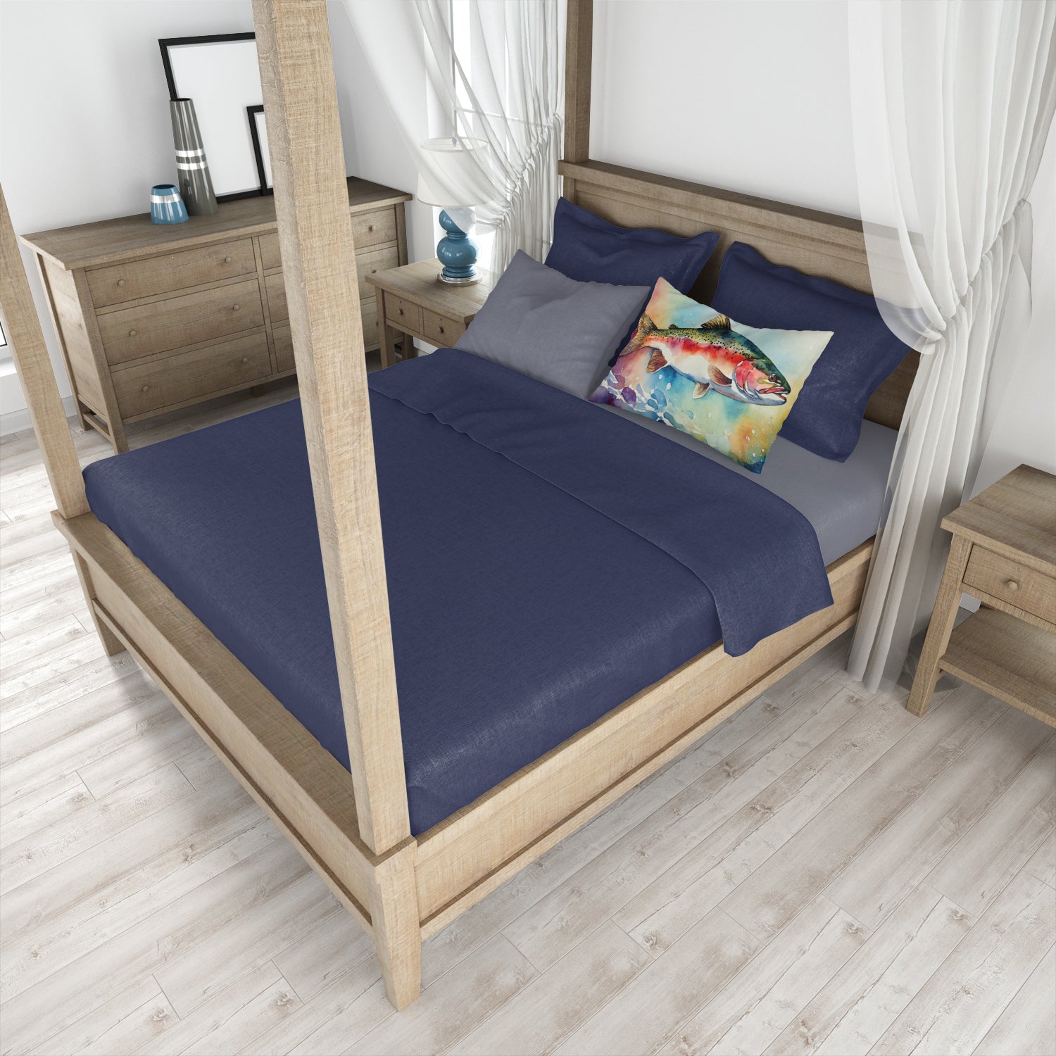 Standard Pillowcase featuring breed specific Rainbow Trout artwork. Experience an upgrade in your sleeping comfort with our Fabric Standard Pillowcase, designed to balance style, comfort, and practicality. Showcasing vibrant artwork on the front and a standard white on the back, this pillowcase is more than a functional item�it's an expression of your personal style. Crafted from premium moisture-wicking material, our pillowcase ensures a pleasant sleeping experience. The breathable performance fabric allows for excellent air circulation, keeping you cool and comfortable throughout the night while also demonstrating exceptional quality. This pillowcase, measuring 30 x 20.5 inches with a slender 0.15 inch thickness, and weighing only 0.25 lbs, fits a standard pillow perfectly. Maintaining our pillowcase is hassle-free. It requires no ironing�simply wash in cold water and dry at medium heat. Bring art and luxury into your bedroom with our Fabric Standard Pillowcase. Its unique design and top-tier fabric contribute to a relaxing and rejuvenating sleep experience. Brighten your bedroom decor while enhancing your sleep with our high-performance pillowcase.