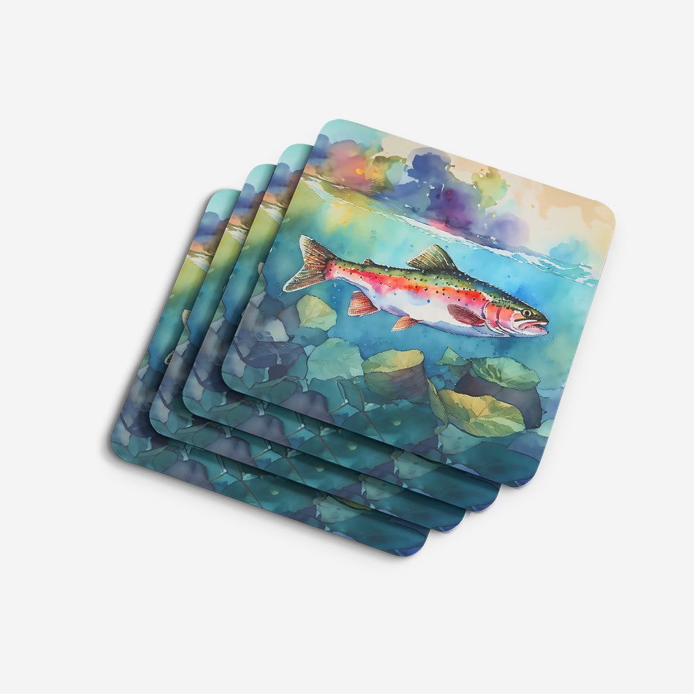 Foam Coasters featuring breed specific Rainbow Trout artwork. Presenting our Set of 4 Foam Coasters, a stylish and practical addition to your table setting. Each square coaster, measuring 3 1/2 inches by 3 1/2 inches, is perfectly sized to accommodate various drinkware, from coffee mugs to tumblers. These coasters stand out with their full-color artwork, permanently dyed onto the material for a vibrant and fade-resistant finish. They're not just functional, they're a fashionable statement, adding a touch of flair to any gathering or event. Our foam coasters serve a dual purpose - they protect your table from water stains and are perfect for both hot and cold drinks. The material used is similar to that of our high-quality mouse pads, ensuring durability and heat resistance. These coasters are easy to maintain - simply wash them in the top of your dishwasher and lay flat to dry. The design won't come off, ensuring they retain their vivid colors for years. Pair them with one of our insulated coolers or huggers for a cohesive, thoughtful gift set. Enhance your beverage experience with our Set of 4 Foam Coasters.