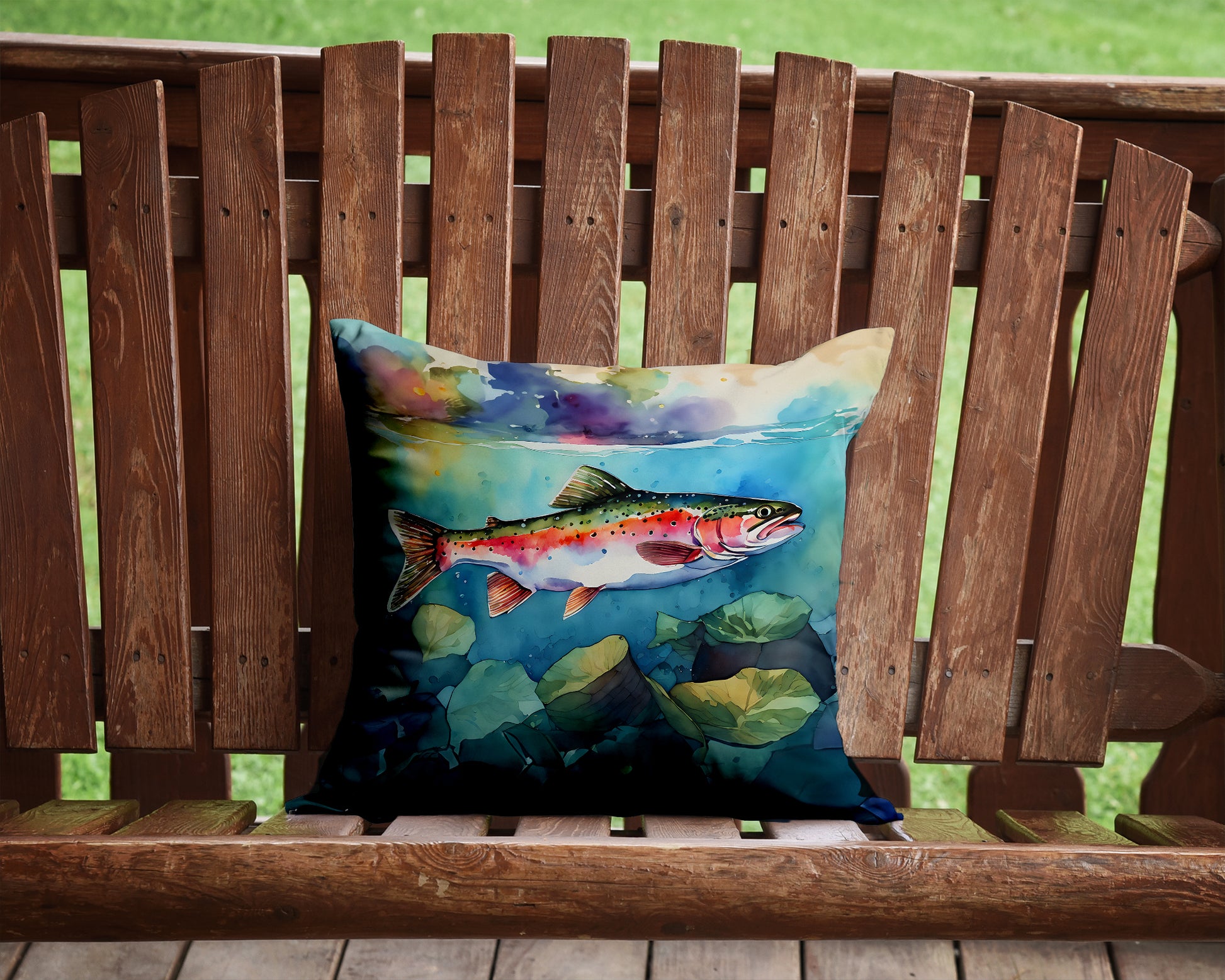 Throw Pillow featuring breed specific Rainbow Trout artwork. Add a touch of vibrancy and comfort to your outdoor seating with Caroline's Treasures Fabric Decorative Pillow. Measuring approximately 14 inches by 14 inches, this outdoor pillow is crafted to elevate the appeal of your patio furniture, infusing it with vivid color and artistic flair. The pillow includes a 100% Polyester Fabric sham filled with a quality pillow form to provide superior comfort. Innovatively made from our brand new material, specifically woven for its water resistance, this pillow is designed for durability. The soft canvas fabric offers versatility in use, fit for your indoor couch or your outdoor patio, porch, or veranda. The fabric is dyed with colorfast dyes built for resilience against weather conditions, ensuring the pillow retains its beauty over time. Constructed by sewing three fabric pieces to create a sham, the polyester insert is then nestled inside to form the pillow, resulting in an overstuffed pillow that maintains its shape. Both the sham and the pillow insert are proudly made in the United States. As the pillows are handcrafted, there may be minor variations in size, further enhancing their unique charm. Experience comfort in style with Caroline's Treasures Fabric Decorative Pillow.