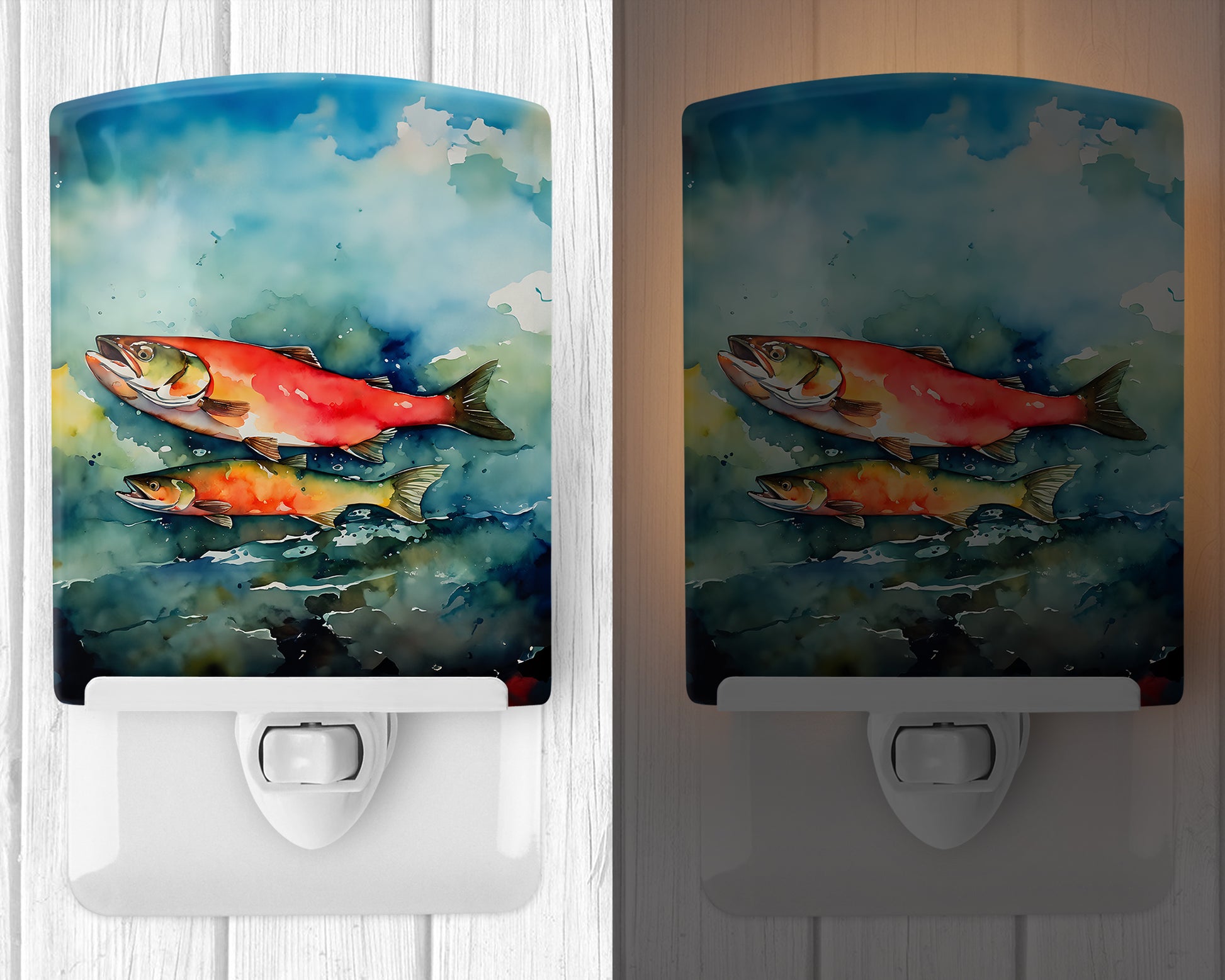 Ceramic Night Light featuring breed specific Salmon artwork. Introduce a splash of artistic flair and subtle illumination to your space with the Decorative Ceramic Night Light from Caroline's Treasures. Perfect for any room, this night light seamlessly blends functionality with an aesthetic appeal, offering a stylish solution to brighten up dark corners of your home or office. Boasting a six-inch high by four-inch wide ceramic tile at the front, it showcases vivid, full-color artwork from distinguished artists, transforming a simple utility into a vibrant art piece. The artwork is securely encased in a robust metal holder, ensuring durability and longevity. Two screws are provided to firmly affix the tile into the holder. The holder extends three inches deep, housing an included bulb that emits a soft, welcoming glow. This product meets all safety standards, as evidenced by its UL approval. Proudly made in the United States from imported components, this Decorative Ceramic Night Light is not just a functional device; it's a statement piece that enhances the ambiance of your surroundings.