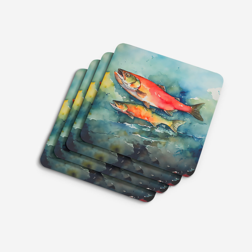 Foam Coasters featuring breed specific Salmon artwork. Presenting our Set of 4 Foam Coasters, a stylish and practical addition to your table setting. Each square coaster, measuring 3 1/2 inches by 3 1/2 inches, is perfectly sized to accommodate various drinkware, from coffee mugs to tumblers. These coasters stand out with their full-color artwork, permanently dyed onto the material for a vibrant and fade-resistant finish. They're not just functional, they're a fashionable statement, adding a touch of flair to any gathering or event. Our foam coasters serve a dual purpose - they protect your table from water stains and are perfect for both hot and cold drinks. The material used is similar to that of our high-quality mouse pads, ensuring durability and heat resistance. These coasters are easy to maintain - simply wash them in the top of your dishwasher and lay flat to dry. The design won't come off, ensuring they retain their vivid colors for years. Pair them with one of our insulated coolers or huggers for a cohesive, thoughtful gift set. Enhance your beverage experience with our Set of 4 Foam Coasters.