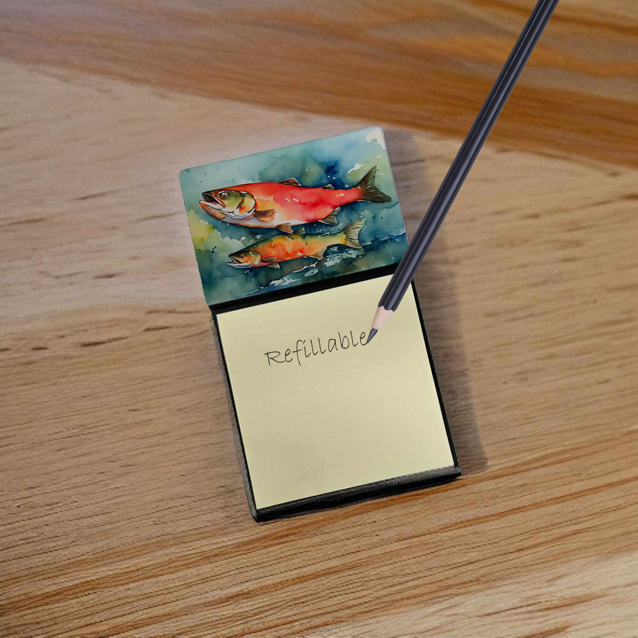 Sticky Note Holder featuring breed specific Salmon artwork. Add a touch of creativity and flair to your desk with the Decorative Sticky Note Holder from Caroline's Treasures. This uniquely designed sticky note dispenser will not only keep your notes in one place but also add an artistic element to your workspace. The top of the holder features beautiful artwork that is sure to catch the eye. Crafted for convenience, this sticky note holder comes with a small pad of 3-inch x 3-inch sticky notes at the bottom. The holder is designed for easy refilling; simply remove the last sheet of a new sticky note pad and stick it onto the board. This feature ensures you will always have sticky notes at your disposal. This Sticky Note Holder makes a perfect gift. Be it for your colleagues at work, your Facebook friends, or even your dog groomer or hairdresser, this versatile product fits the bill. You can use it for making grocery lists, leaving notes for loved ones, or for jotting down important reminders. The bottom board is rigid and can be magnetized by adding a business card size magnet to the back (sold separately). This makes it even more versatile, allowing you to place it on a refrigerator or any other magnetic surface. With this Sticky Note Holder, you're not only organizing your notes, but also personalizing your space.