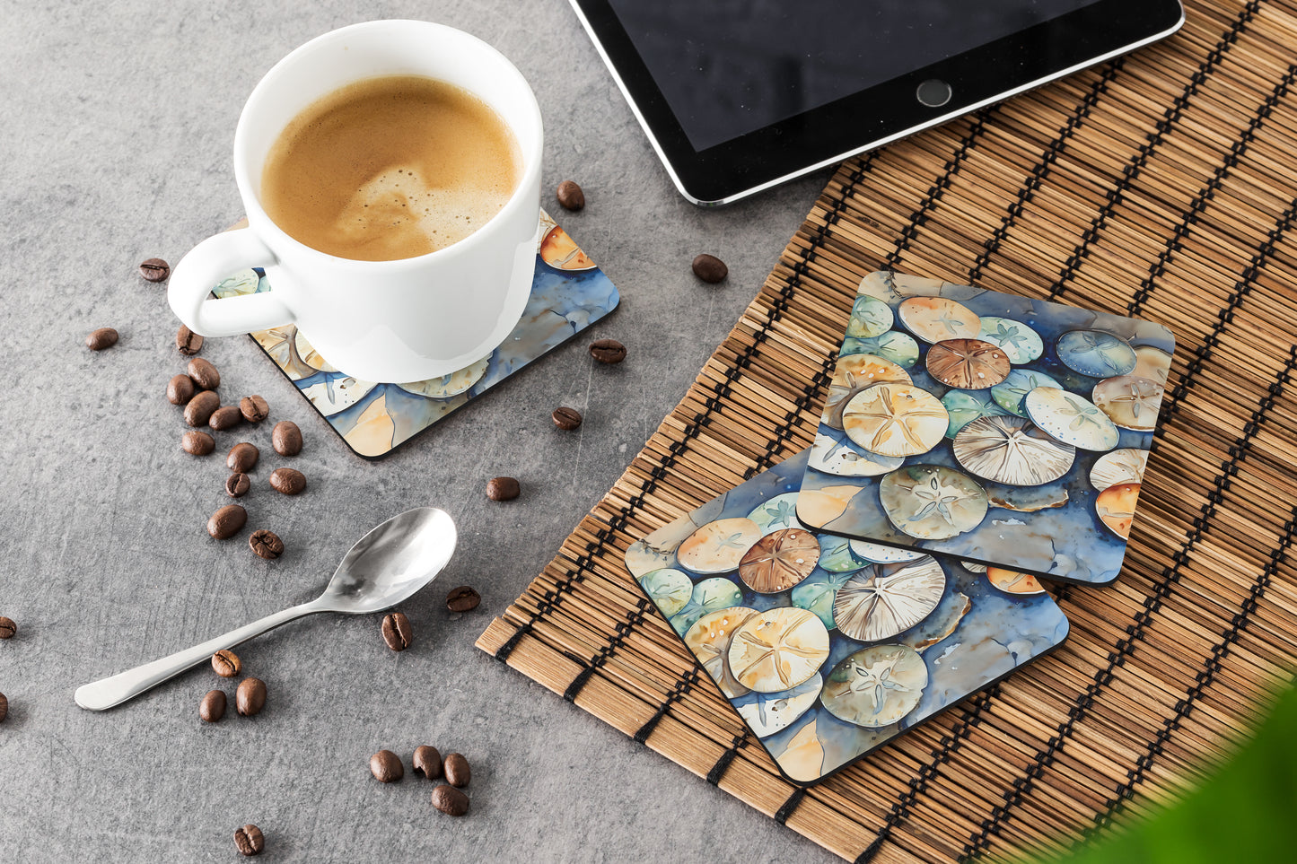 Foam Coasters featuring breed specific Sand Dollars artwork. Presenting our Set of 4 Foam Coasters, a stylish and practical addition to your table setting. Each square coaster, measuring 3 1/2 inches by 3 1/2 inches, is perfectly sized to accommodate various drinkware, from coffee mugs to tumblers. These coasters stand out with their full-color artwork, permanently dyed onto the material for a vibrant and fade-resistant finish. They're not just functional, they're a fashionable statement, adding a touch of flair to any gathering or event. Our foam coasters serve a dual purpose - they protect your table from water stains and are perfect for both hot and cold drinks. The material used is similar to that of our high-quality mouse pads, ensuring durability and heat resistance. These coasters are easy to maintain - simply wash them in the top of your dishwasher and lay flat to dry. The design won't come off, ensuring they retain their vivid colors for years. Pair them with one of our insulated coolers or huggers for a cohesive, thoughtful gift set. Enhance your beverage experience with our Set of 4 Foam Coasters.
