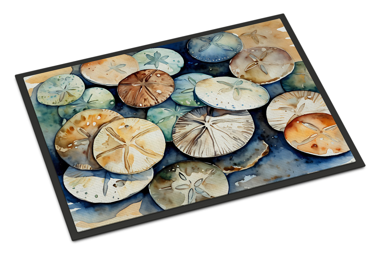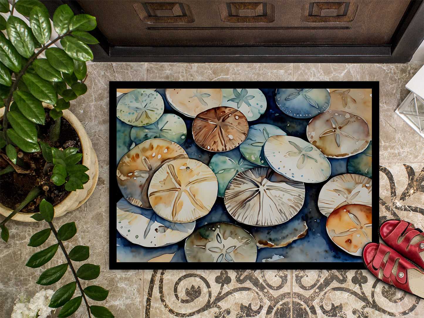 Doormat featuring breed specific Sand Dollars artwork. Welcome your guests in style with our Artwork Door Mat, designed to withstand almost any weather condition. This mat, measuring approximately 18 by 27 inches, is held together by durable black binding tape. Its top layer, composed of polyester felt, is dyed with the eye-catching image you see on the mat. A few layers below provide the mat with stability, while its rubber bottom is stamped to help prevent slipping and ensures safety. Our mat works wonderfully as both an indoor or outdoor door mat. For cleaning, simply hose it off with water or use a power washer - no need for any cleaner that produces suds. Avoid scrubbing with a brush, instead, opt for the vacuum on floor setting. Designed manufactured and printed in the USA, this mat is a perfect addition to your porch, outdoor kitchen, entryway, or any indoor space. Its unique design makes it a charming decorative rug that greets your guests and adds a stylish touch to your home decor.